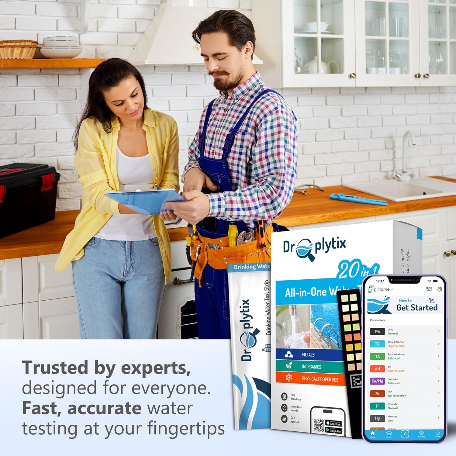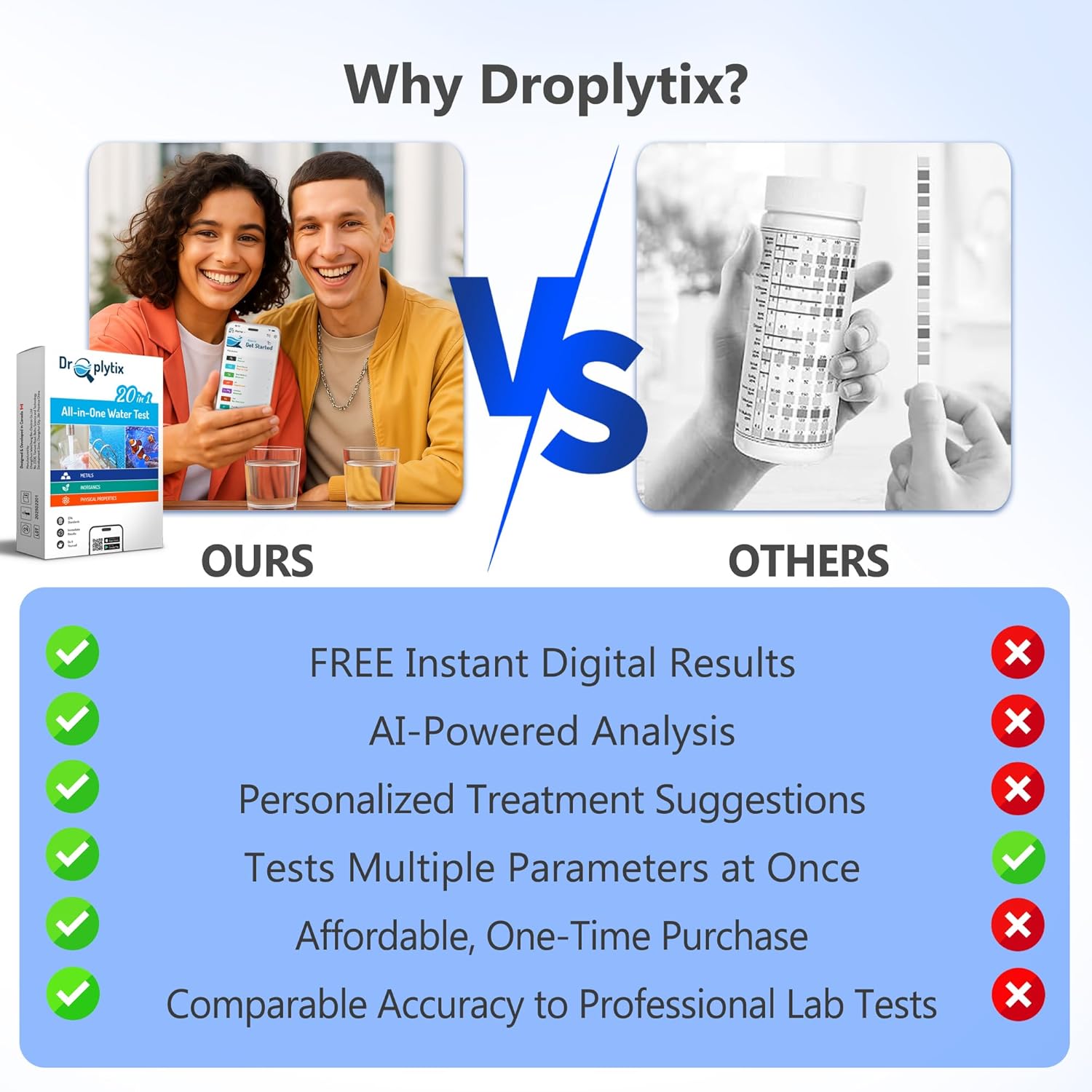 - [20-IN-1 WATER TEST KIT WITH APP-DRIVEN RESULTS]: Test for 20 essential water quality parameters including pH, Hardness, Lead, Total & Free Chlorine, Nitrate, Iron, Fluoride, and more. The DROPLYTIX app reads the strip through your smartphone camera and delivers fast, accurate numerical results in under 2 minutes. Ideal for users needing a reliable at-home water test kit for pools, drinking water, aquariums, and well water.