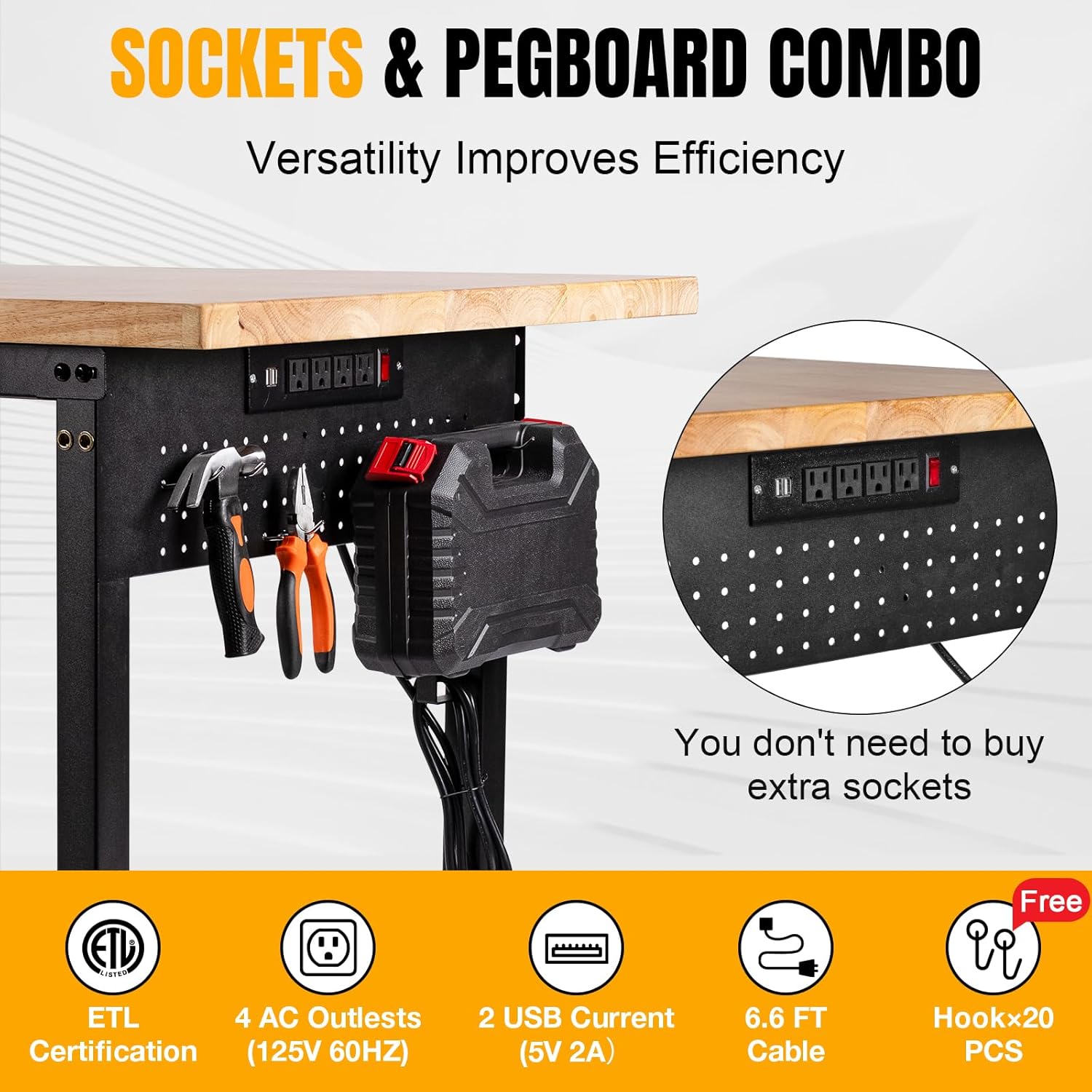 - POWER OUTLET AND PEGBOARD: The garage table is equipped with ETL certified power outlets for more safety and durability. 4 AC outlets, 2 USB ports, cord length 6.6 inches, easy to use a variety of appliances and lamps. In addition, we matched with a pegboard and hooks for easy storage of tools to keep your workbench neat and tidy.