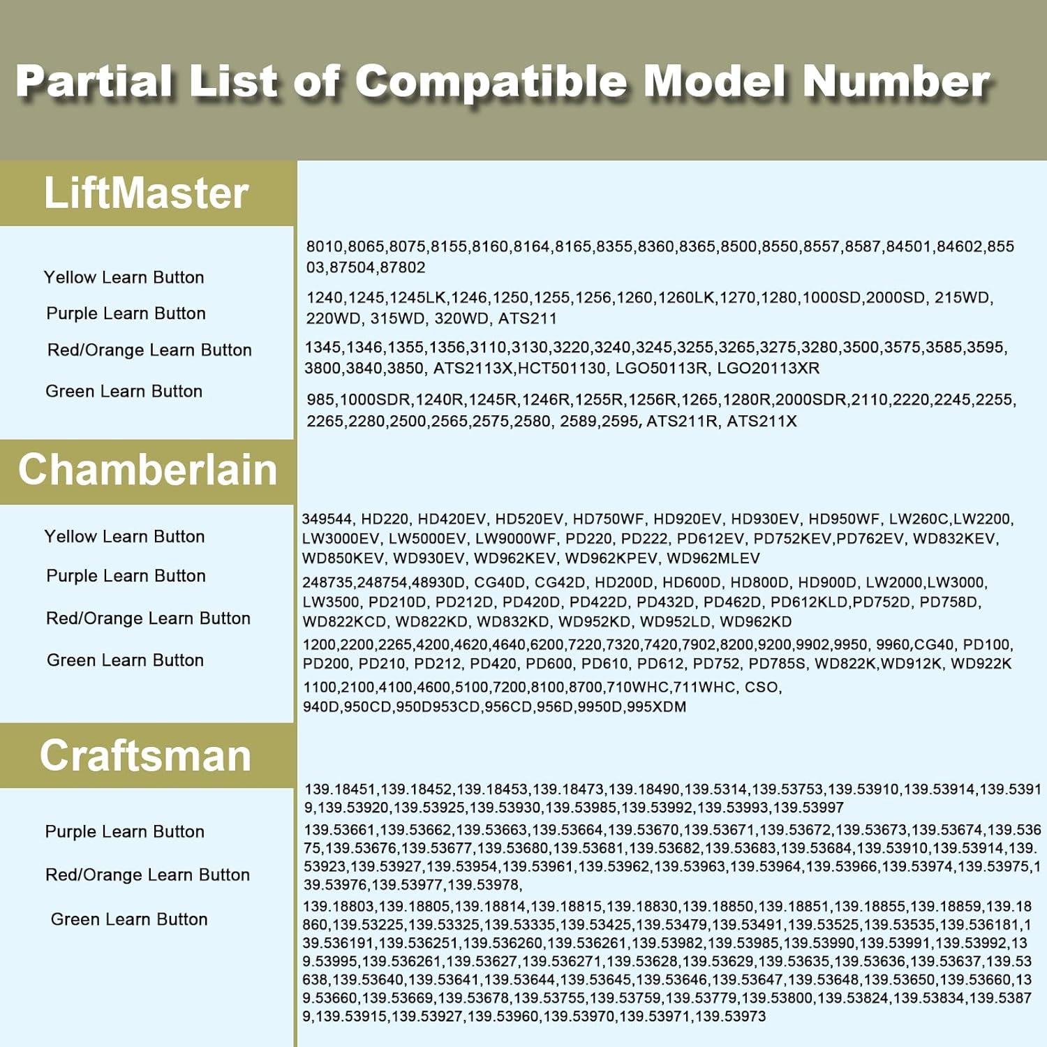 - 【Compatibility】The Garage Door Wireless Keypad compatible with liftmaster/craftsman/chamberlain garage door openers manufactured since 1993. Works with openers of Yellow Learn Button (Security + 2.0), Purple Learn Button (315 MHz Security+), Red/Orange learn button (390 MHz Security+), Green Learn Button (390 MHz Billion Code). Replaces G940EV-P2, 878MAX, 877MAX, 877LM, 377LM, 977LM. Does not work with Craftsman 200.57933 57943 57953 Series 100 CR1150 139.57943 139.57953. The keypad does not support openers that use WI-FI connections.