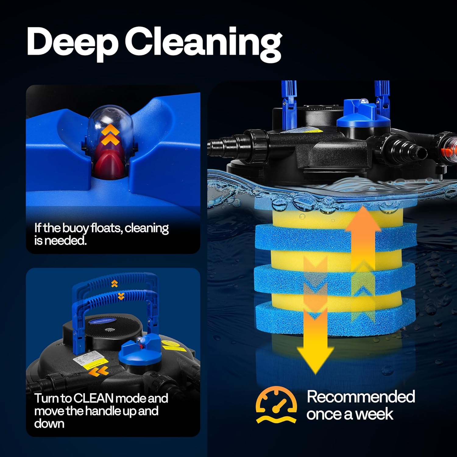 - EASY OPERATION & MAINTENANCE: The function switch allows you to easily switch between FILTER and CLEAN modes; Turn to sewage outlet and repeatedly move the handle up and down until clear water flows from the outlet, which ensures a more thorough cleaning of the filter sponges; When the buoy floats, itβs time to clean it; It is recommended to clean the filter sponges once a week to maintain optimal performance; A separate lamp replacement guide and an extra lamp are included for your convenience