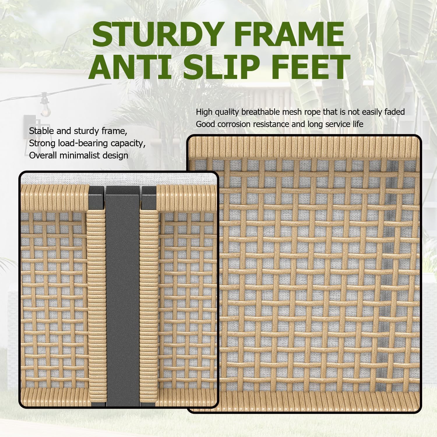 - Weather-Resistant & Durable: Crafted with polypropylene fiber and high-density PE webbing, this Aluminum Patio Furniture Set resists UV rays, water, and tears. The sturdy woven design supports up to 500lbs, ensuring long-lasting performance in any outdoor environment.