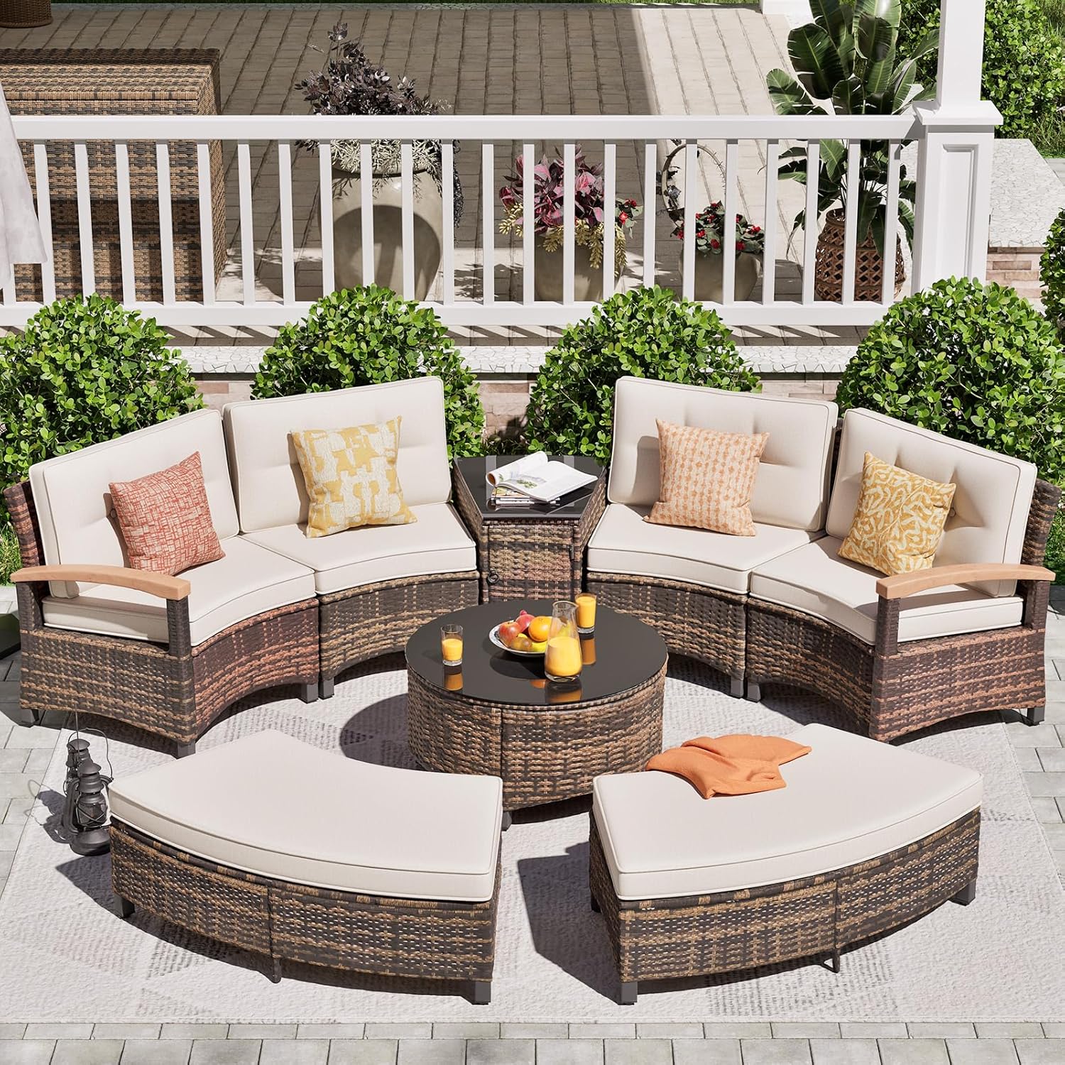 - Unique Half-Moon Design: This half-moon patio furniture set features a stylish semi-circular lounge with four curved sofas and two Half-Moon Ottomans, perfect for outdoor gatherings on your balcony, patio, or poolside