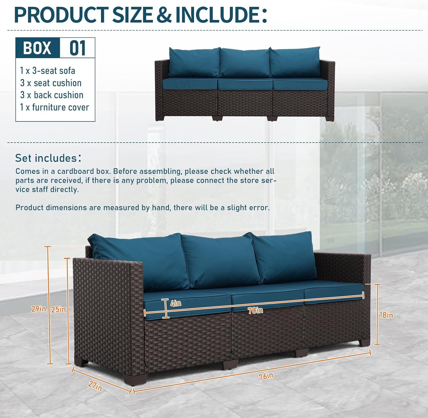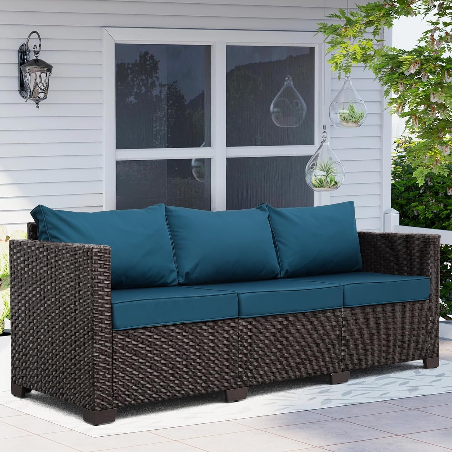 Outdoor Furniture Wicker Outdoor Couch Patio Furniture 3-seat Sofa Deep Seat Hight Backrest Non-Slip Cushions, Peacock Blue