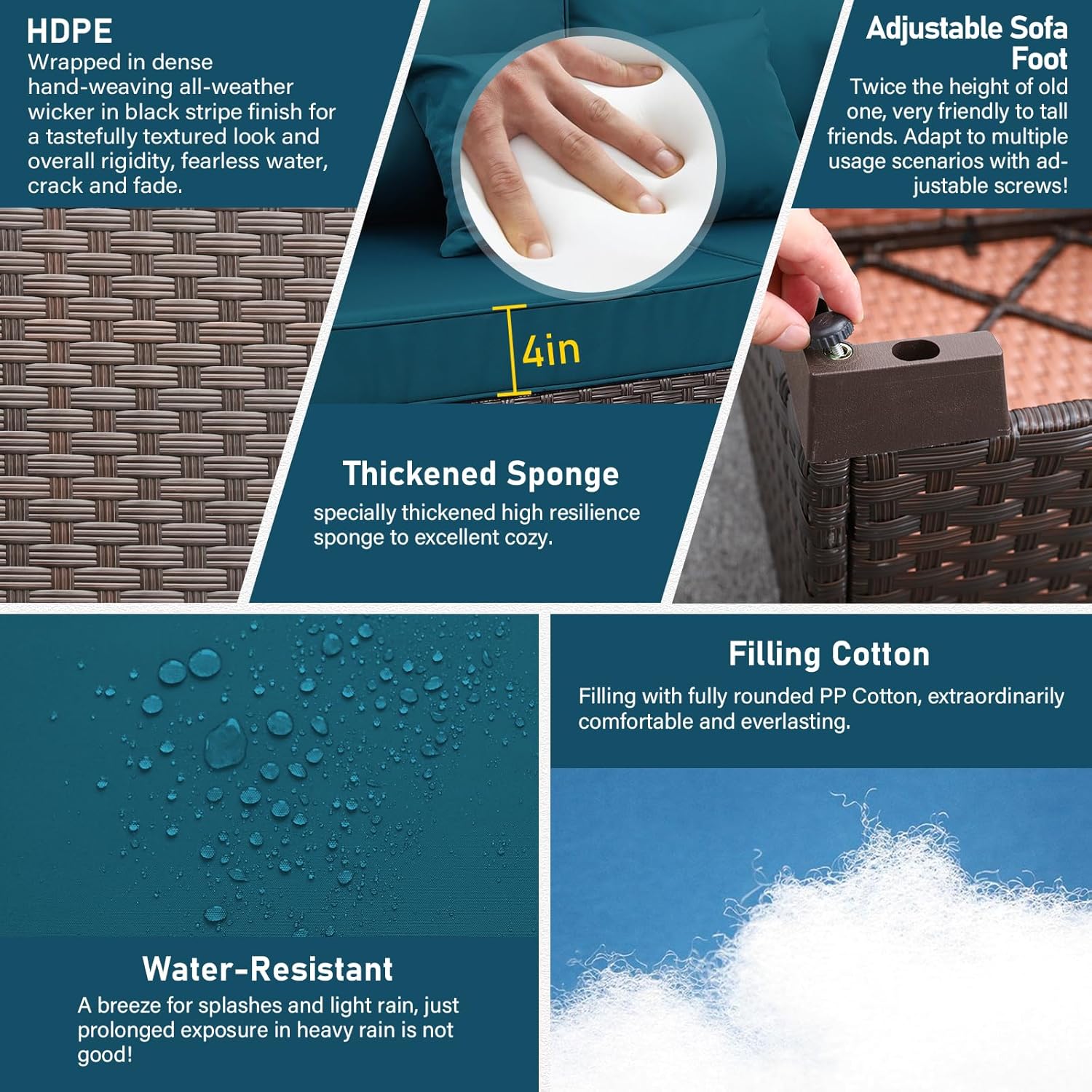 - Quality & Maintain: Delicate composite weaving with half-moon and round all-weather HDPE wicker material handwoven over fully-welded powder-coated steel framing makes outdoor patio furniture very durable and sturdy. Breathable 250G polyester Anti-UV and water-repellent fabric. Each piece is designed to withstand sunshine beating down and rainstorms rolling through.