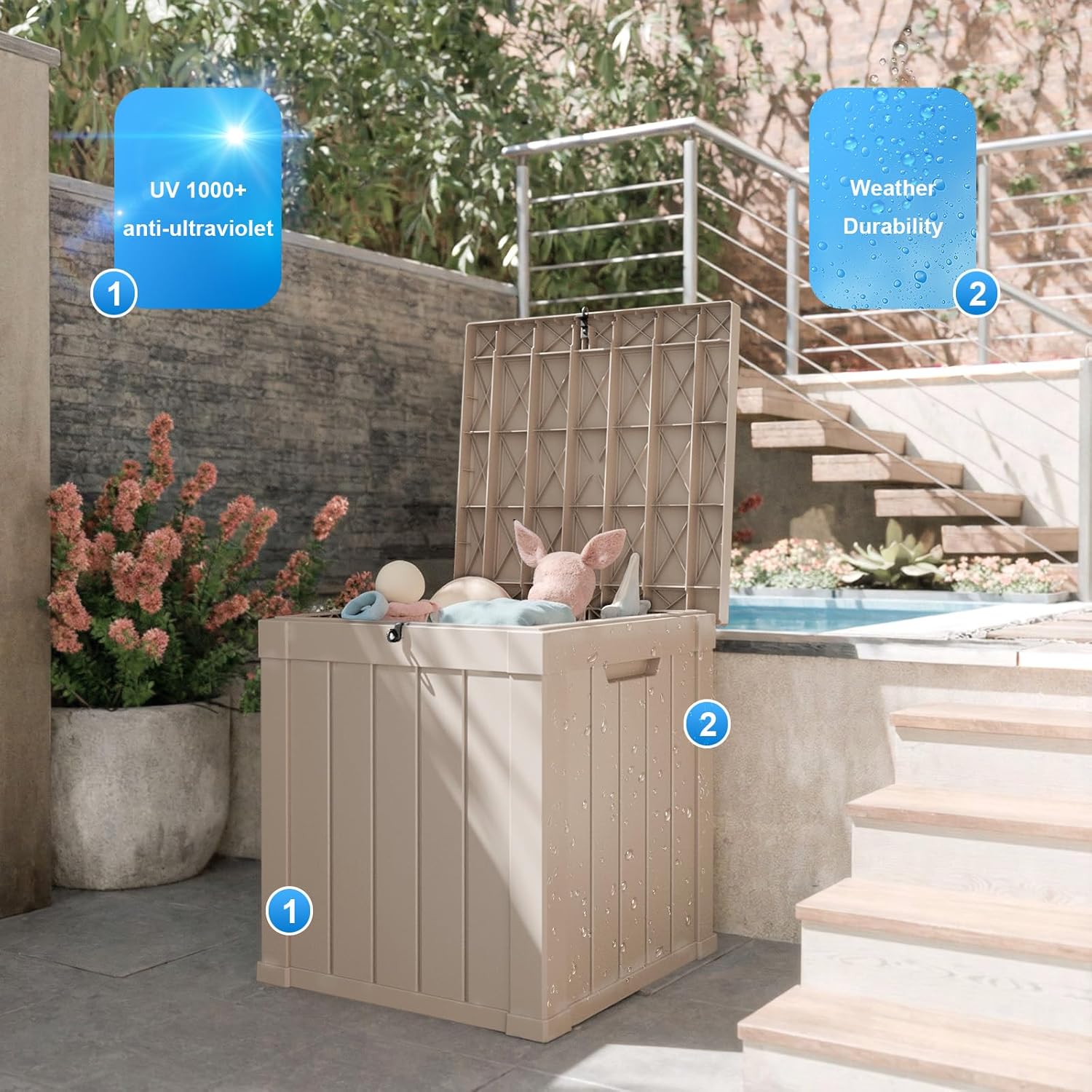 - Durable and Sturdy:Built with strong plastic, this deck box is UV-resistant and won't fade or crack in the sun. It’s designed to withstand harsh outdoor conditions and provide long-lasting durability.