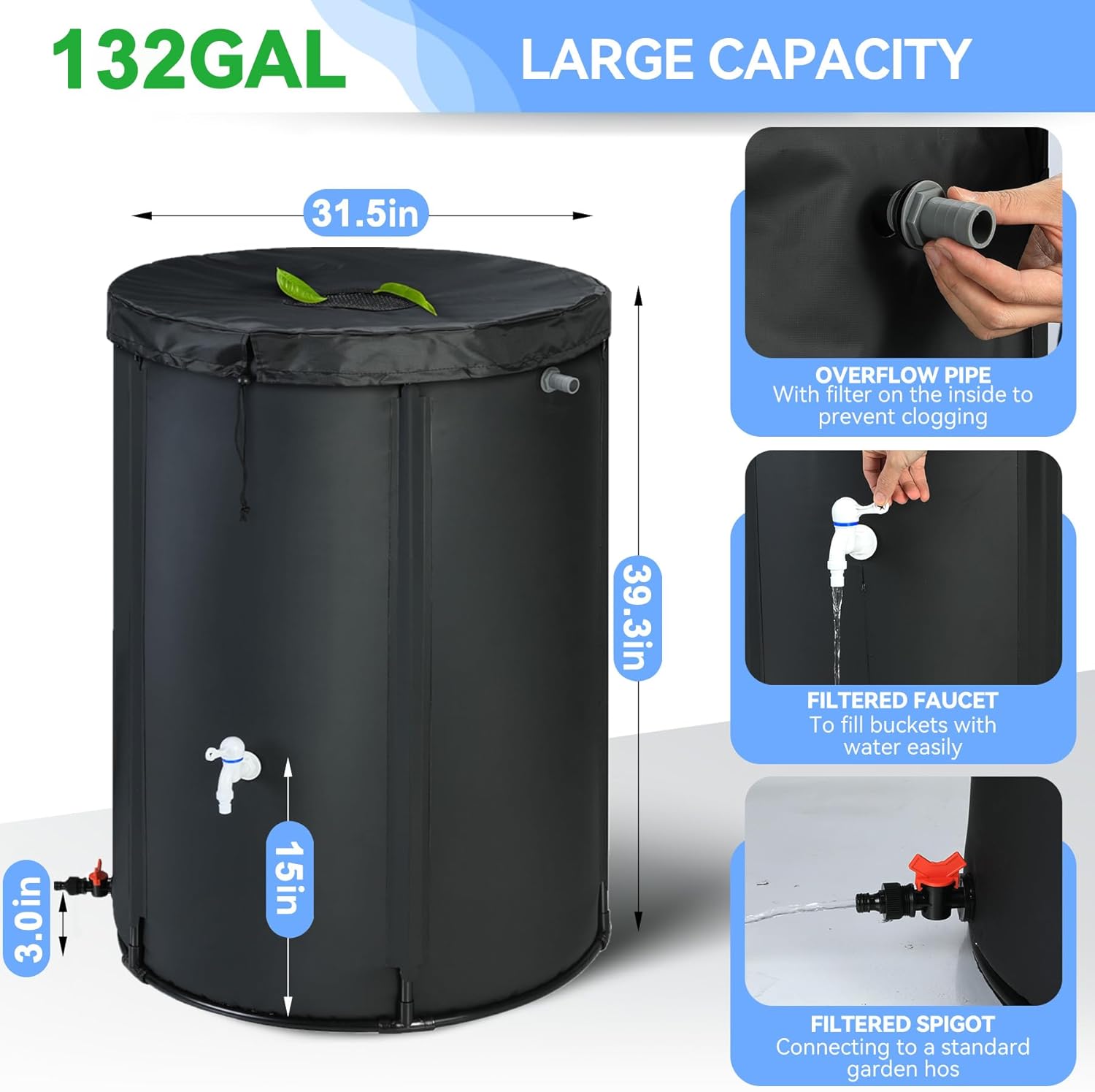 - Large Capacity: 132-gallon rain barrel offers a convenient and efficient way to collect and store rainwater for gardening, cleaning, and emergency preparedness