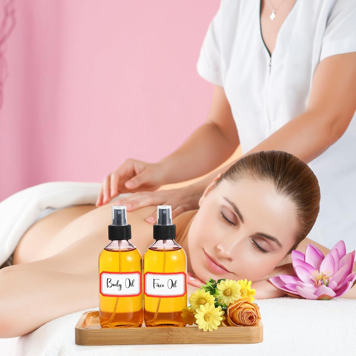 Norme 12 Pcs 8 oz Glass Spray Bottles with Funnels and Labels Refillable Cosmetic Empty Spray Bottles with Sprayer Containers for Essential Oil Cleaning Solutions(Pink,Stylish)