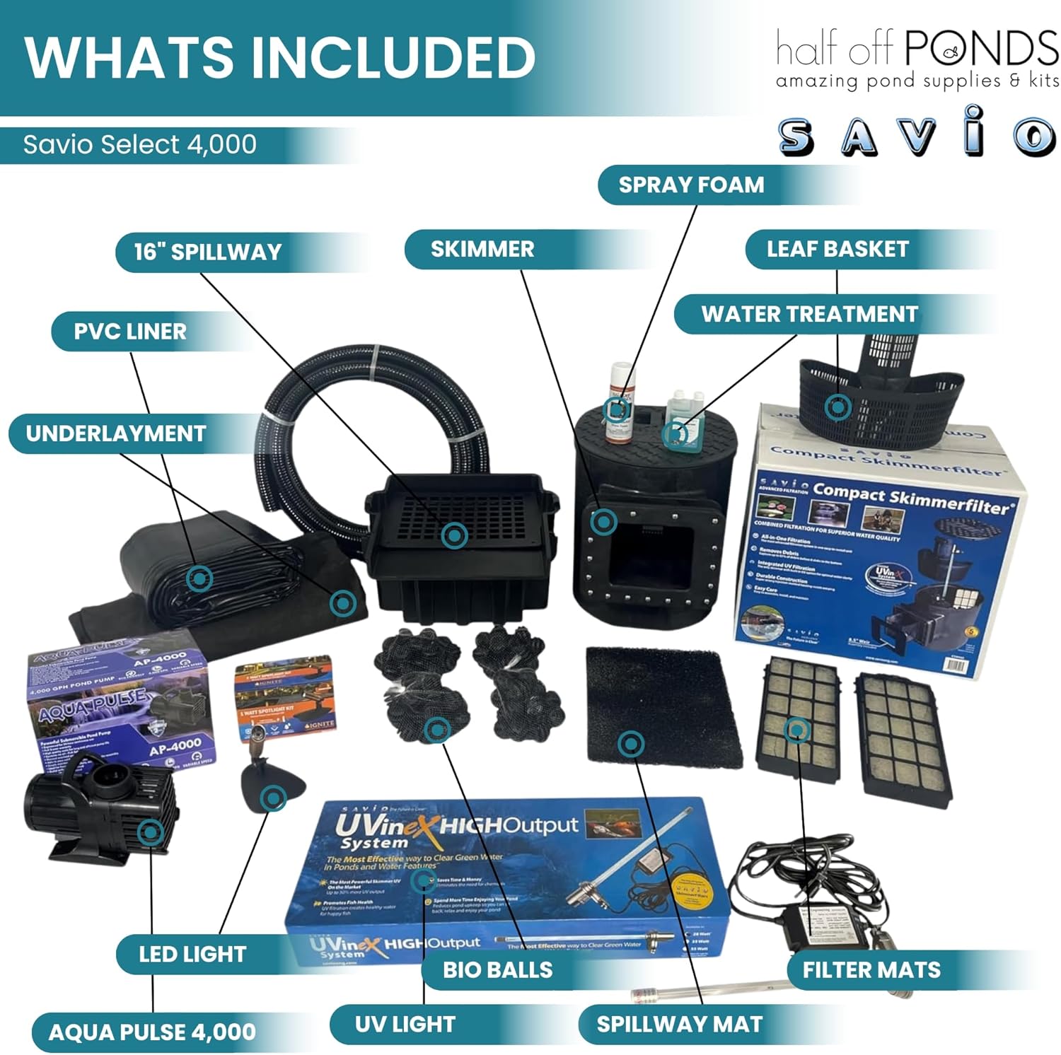 HALF OFF PONDS Savio Select 4,000 GPH Submersible Pump Pond Kit with 15' x 20' PVC Plastic Pond Liner, UV Clarifier for Water Garden & Koi Pond