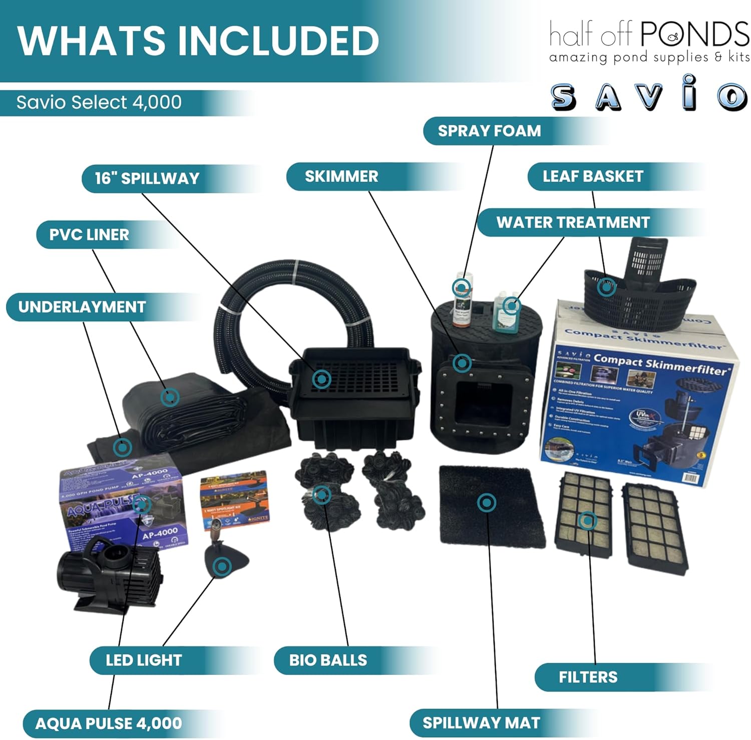 HALF OFF PONDS Savio Select 4,000 GPH Submersible Pump Pond Kit with 10' x 15' PVC Plastic Pond Liner for Water Garden & Koi Pond