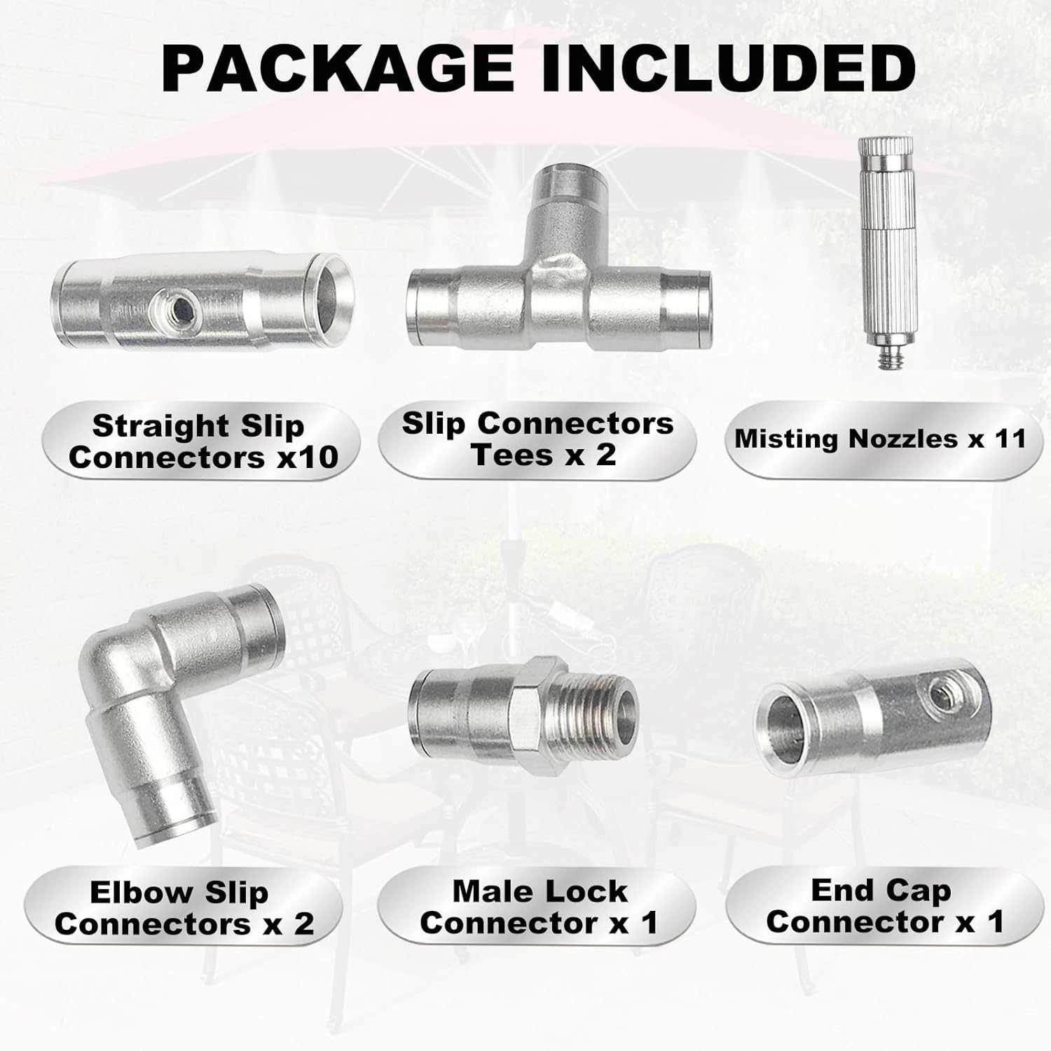 - 【Complete Misting Solution】 This kit includes 11 precision misting nozzles and 16 durable slip connectors, giving you all the essential components for a fully functional outdoor cooling setup or easy replacements.