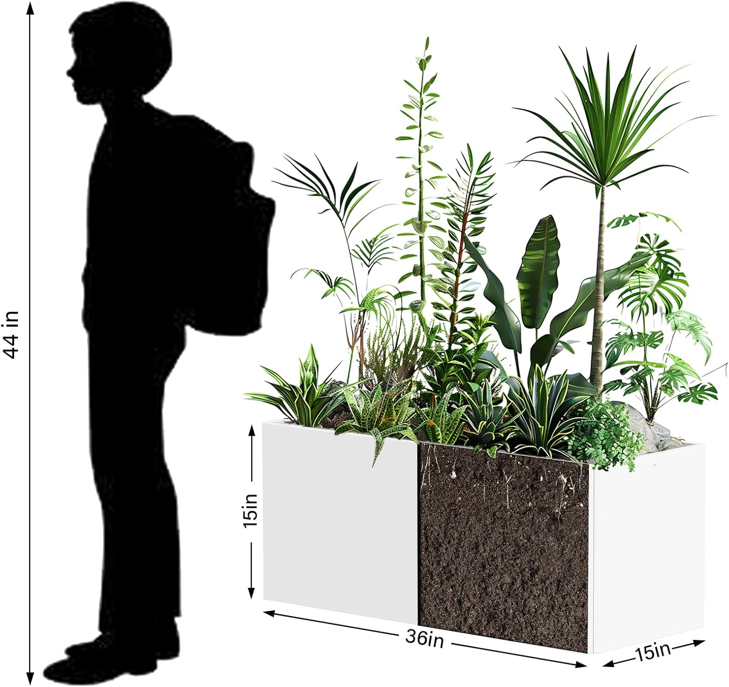 - Large Capacity: 15" in height, 15" in width, and 36" in length to accommodate tall plants and trees flowers, or shrubs—ideal for creating lush displays on patios, porches, decks, or garden borders