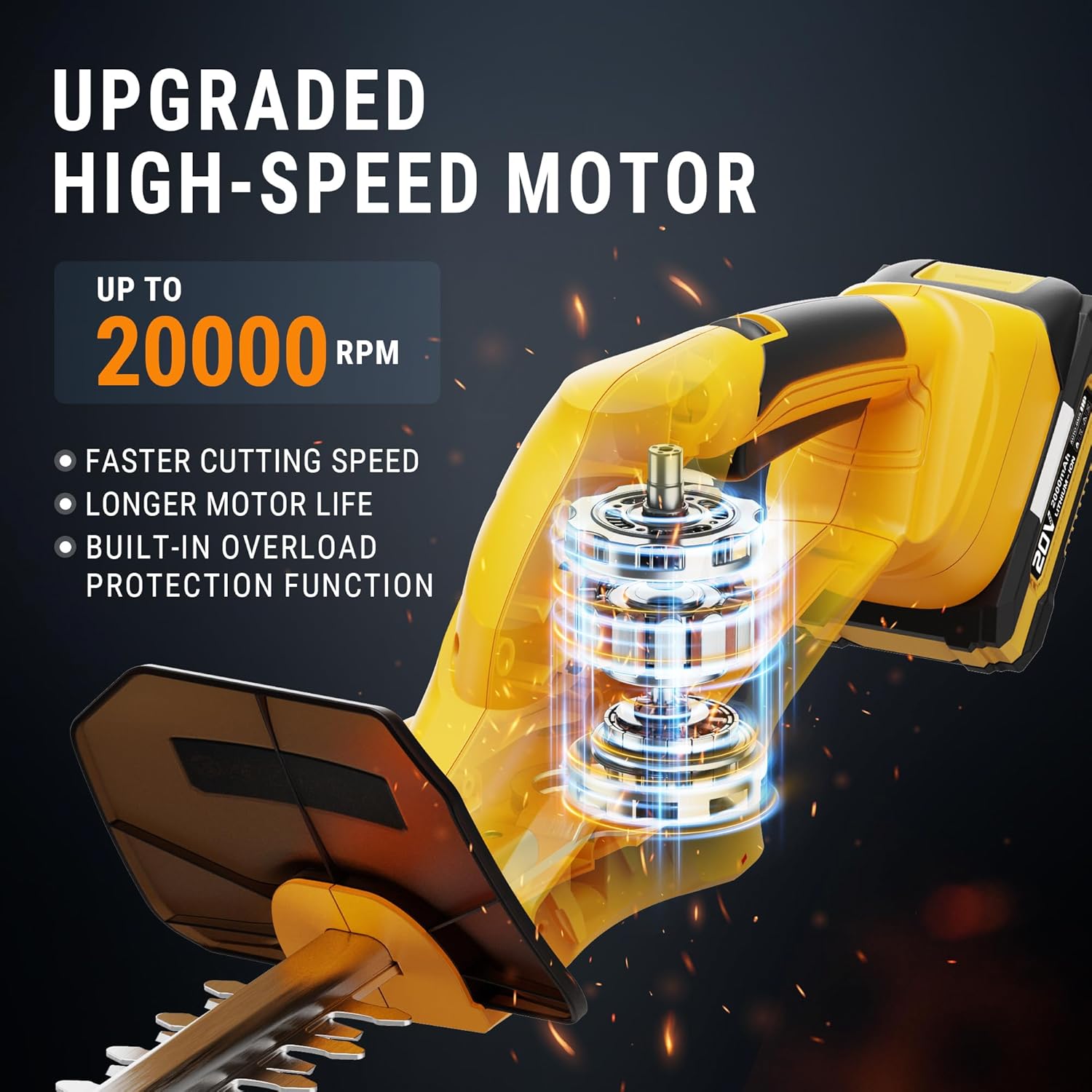 - [Powerful cutting ability] EWORK cordless hedge trimmer is equipped with a reinforced copper wire motor and built-in overcurrent protection program, which improves the stability of hedge trimmer operation and prolongs service life; equipped with a 22-inch double-action laser blade with a cutting diameter of 5/8 inches, this hedge trimmer can complete almost all garden work and bring you an extraordinary hedge trimming experience