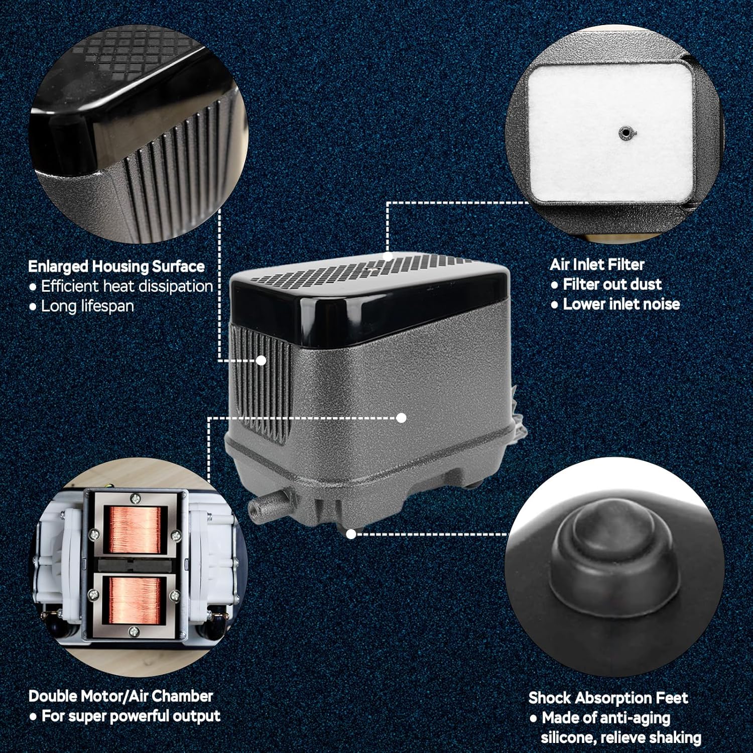 - SPECIFICATION - This linear air pump delivers a max of 4000GPH powerful airflow at 0.05MPa pressure with an 230W energy-efficient copper coil motor that runs in stable operation and lasts longer. Perfect as a pond aerator, septic aerator, hydroponic air pump, or aquarium air pump, it provides high efficiency, low heat and low power consumption.