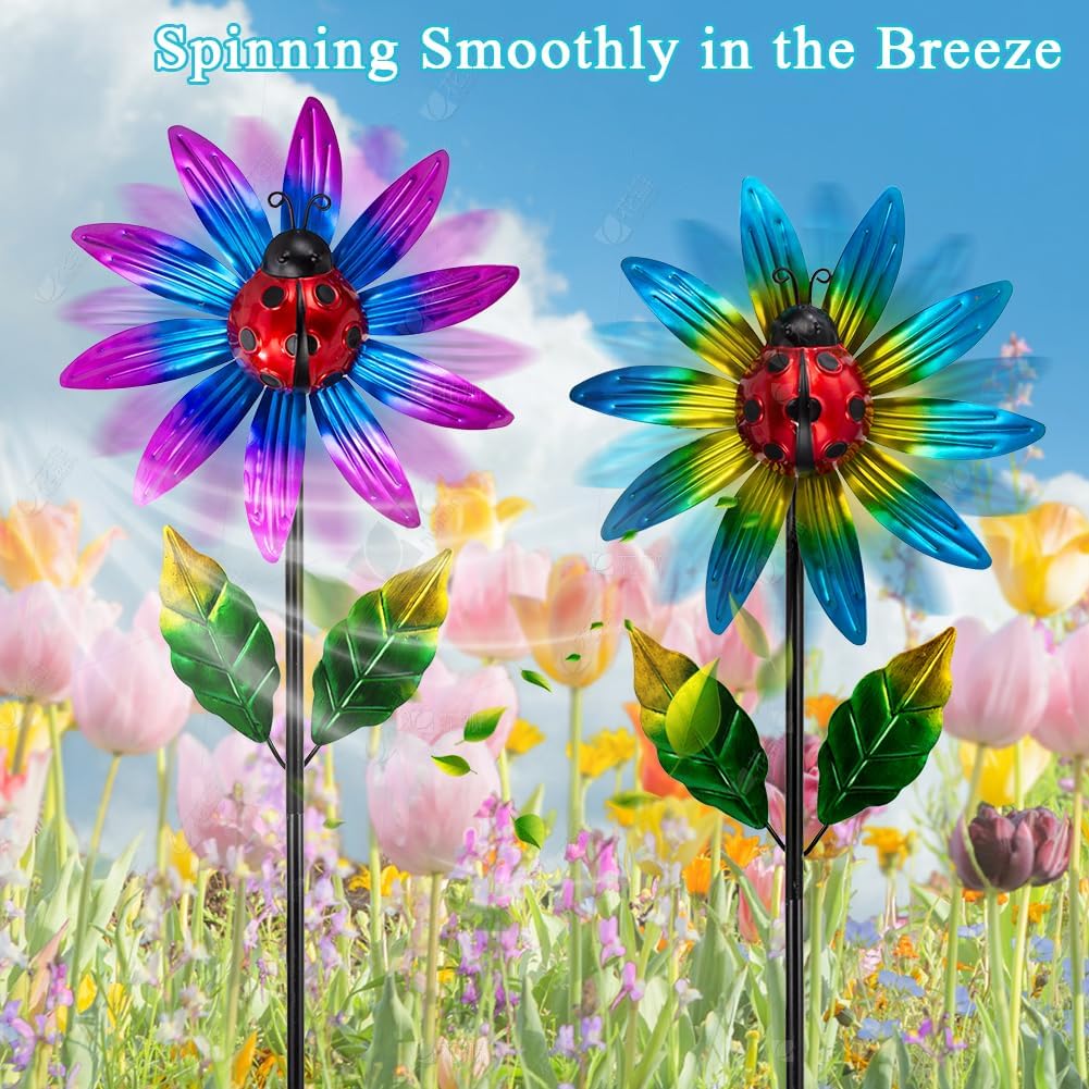 - Unique Design: This garden wind spinners feature flower elements, the bearing cover is designed as a ladybug, adds agility and vitality to the windmill. They will demonstrates a lovely show in the wind, adding fun and color to your outdoor