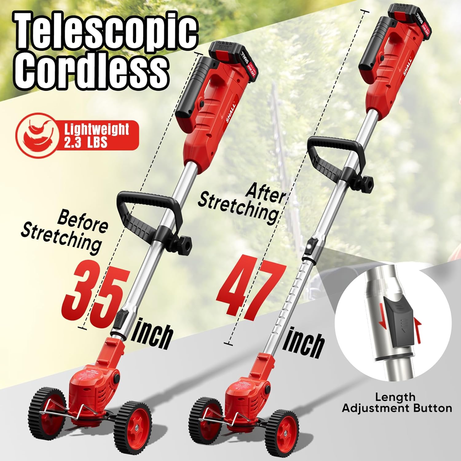 - [Rotatable Head & Removable Wheels] - The head angle of battery powered weed eater (cortadora de pasto) can be adjusted from 0-90Β°, which makes it easy to trim in tight spaces or uneven terrain; The wheels are removable and can easily converts from a trimmer to a wheeled edger