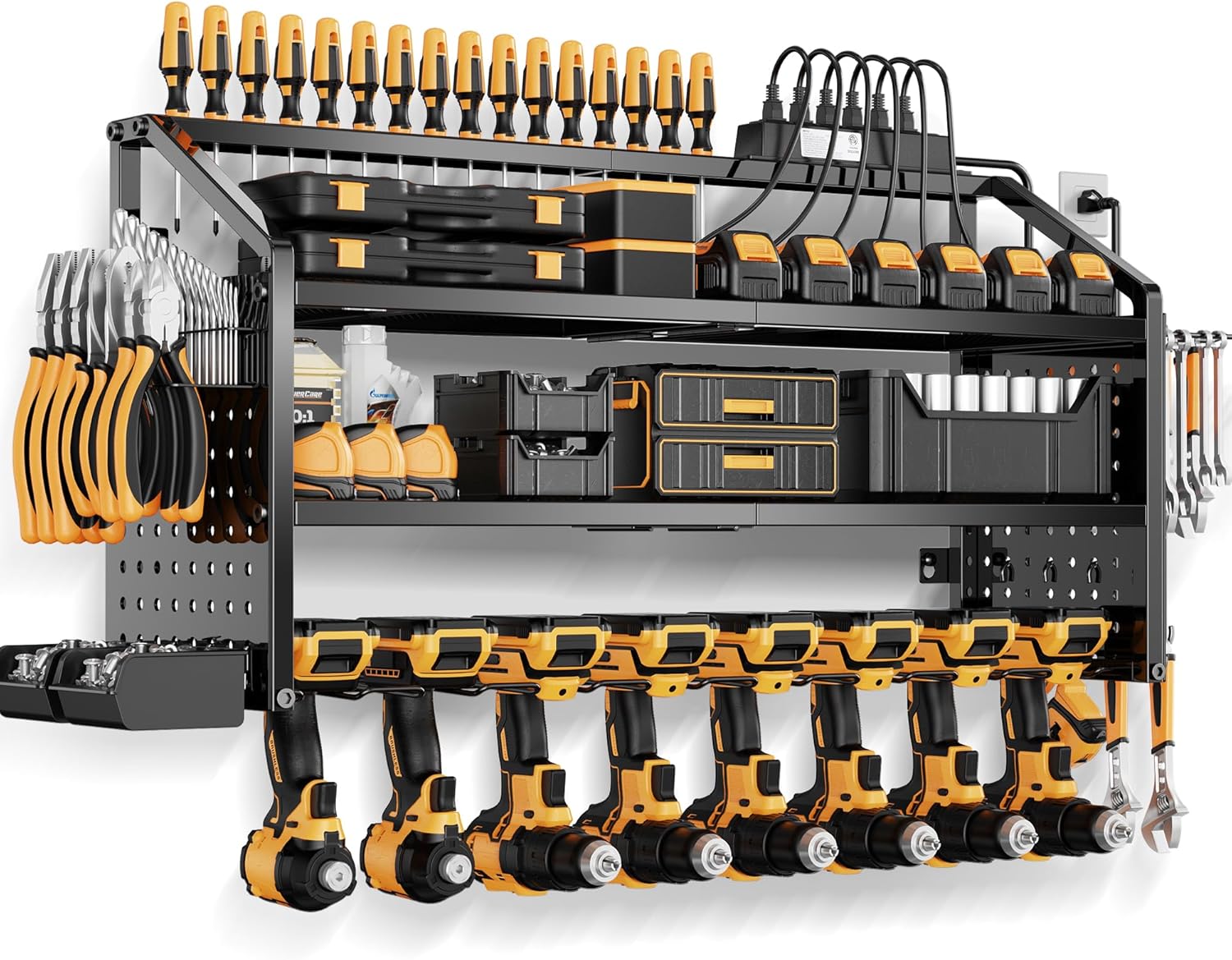 LBT Large Power Tool Organizer Wall Mount with Charging Station, 8 Drill Holder, 4 Layer Heavy Duty Metal Tool Storage Rack, 6 Power Strip, 8 Hooks, 2 Screw Boxes, Cool Gifts for Him Fathers Day