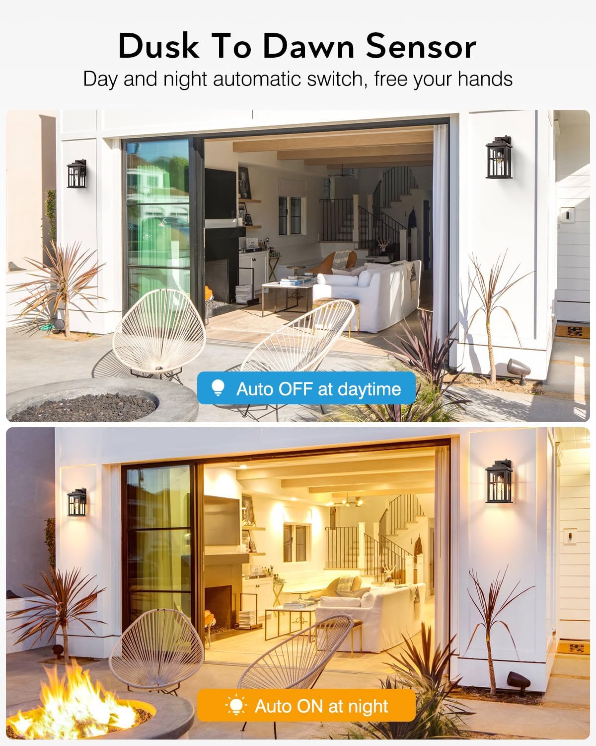 - Ultra-sensitive Dusk-to-Dawn Sensor: Our dusk to dawn outdoor lighting fixture detects subtle changes in light with scientific accuracy. When the night falls, it kicks on in seconds, providing 8 hours of warmth and illumination for your entryway. When the dawn comes, the pathway's light dims; the light-sensitive wall sconce makes it easy for you to save energy and stop struggling with the quiet loss of power. No programming, no complicated buttons - the simple design frees your hands.