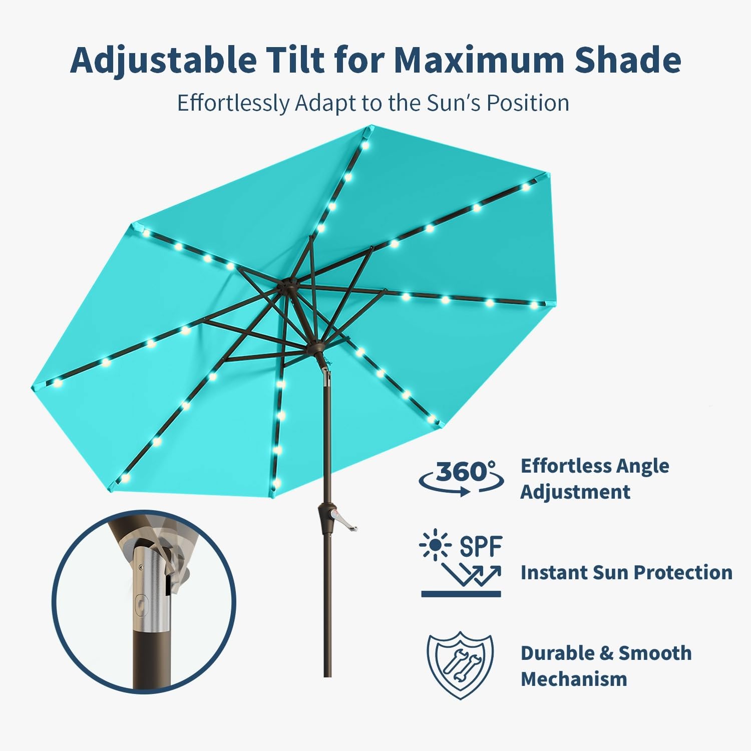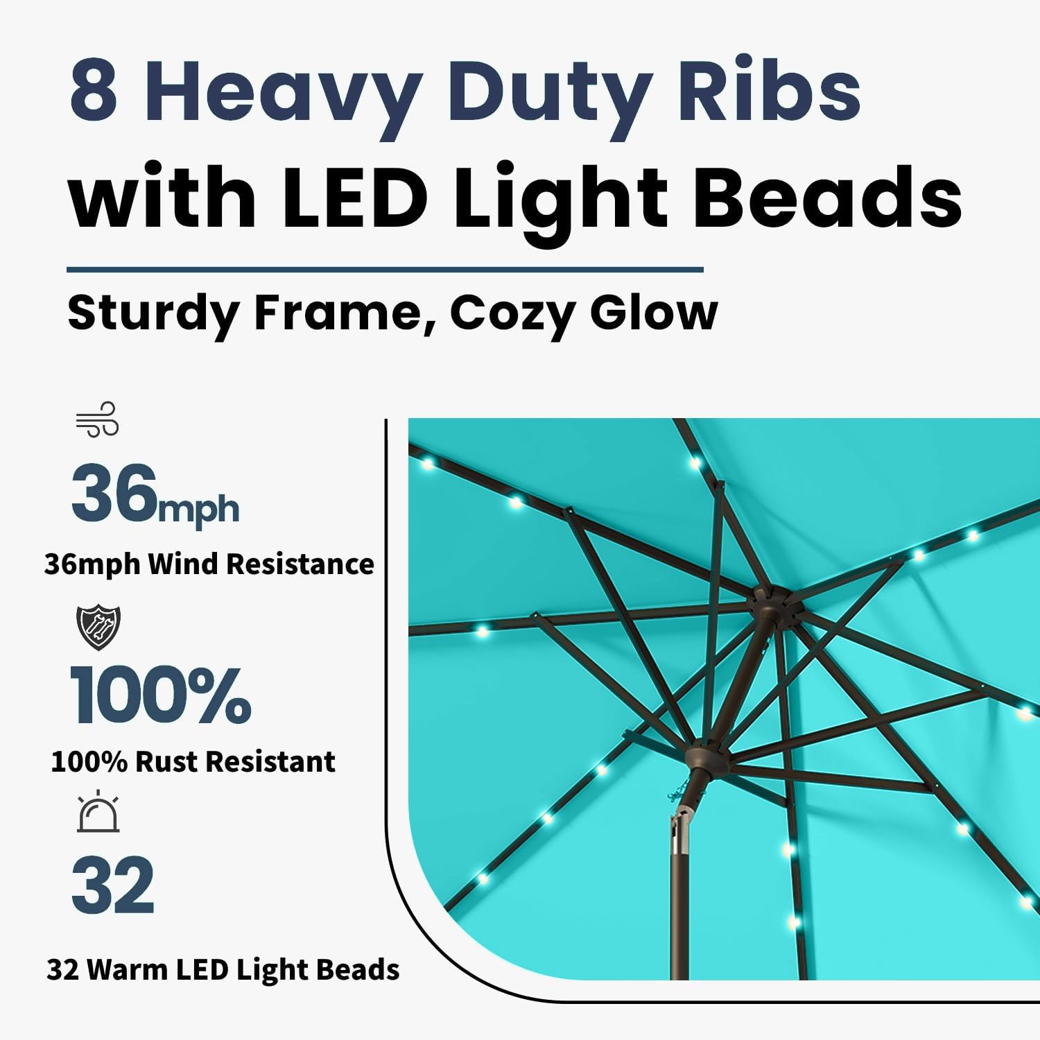9FT Solar Umbrella 32 LED Lighted Patio Umbrella Table Market Umbrella w/Tilt and Crank, UV-Resistant Outdoor Umbrella for Pool, Garden, Deck, Aqua Blue