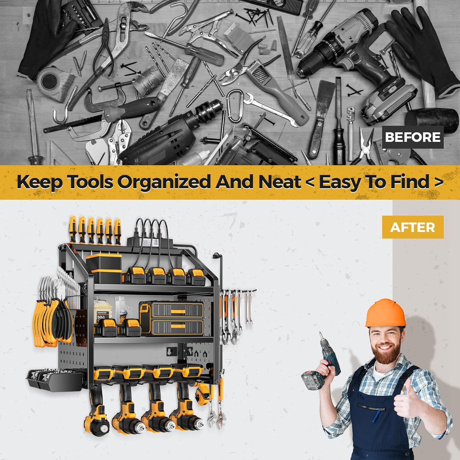 LBT Heavy Duty Metal Power Tool Organizer Wall Mount with 4 Outlet Charging Station & Drill Holder, 4 Layer Garage Storage Rack 120LB, Gift for Men Dad Husband (Workshop, Anniversary, Father's Day)