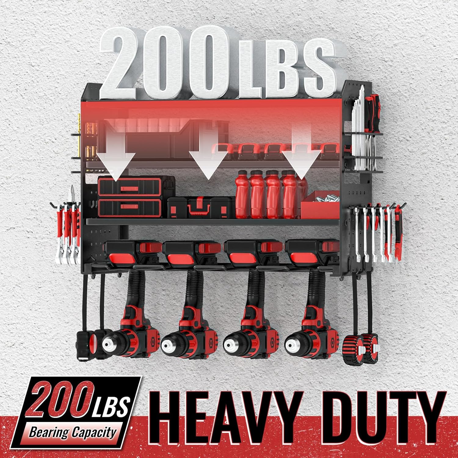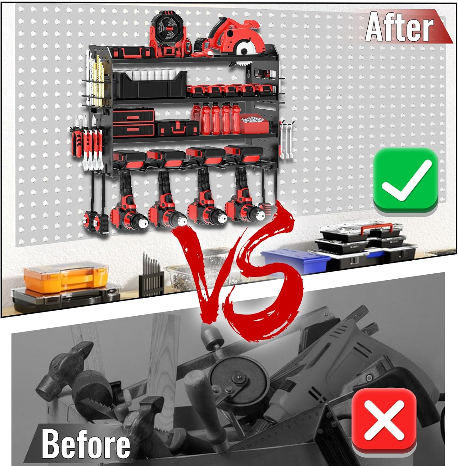 - 【4-tier High-capacity Storage】This power tool organizer uses the latest four-tier high-capacity design. The bottom layer can store 4 cordless drills, the upper three layers can store other heavy tools or various small tools, and a hammer holder, pliers holder and screwdriver holder are added to the side.providing you a neat and efficient workbench!