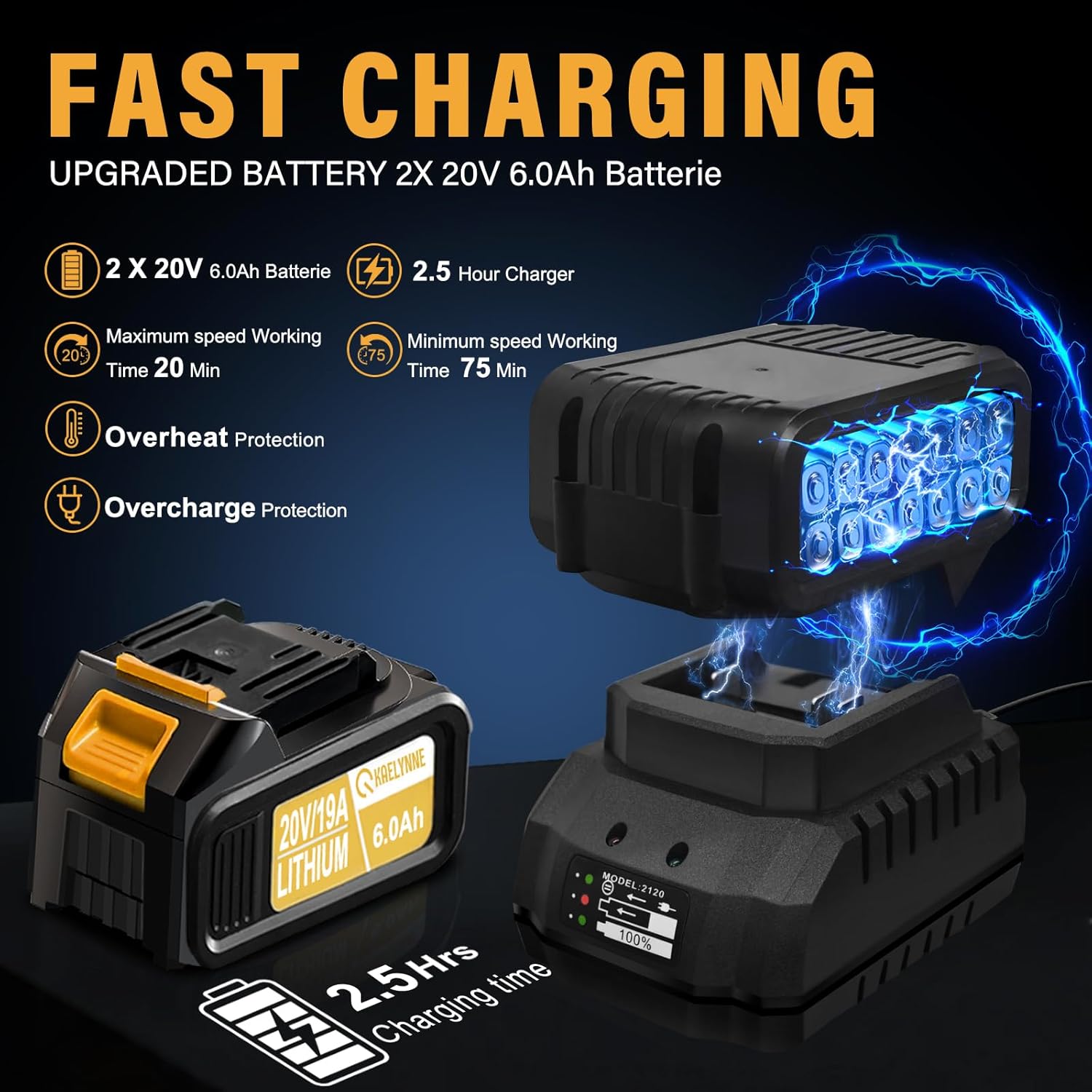 - ăLong-lasting BatteryăKaelynne electric leaf blower comes with two 20V-6.0Ah batteries and a fast charger, which meets UL safety test standards. After fully charged, the two batteries can be used for 20 minutes at maximum power and 60 minutes at medium power.