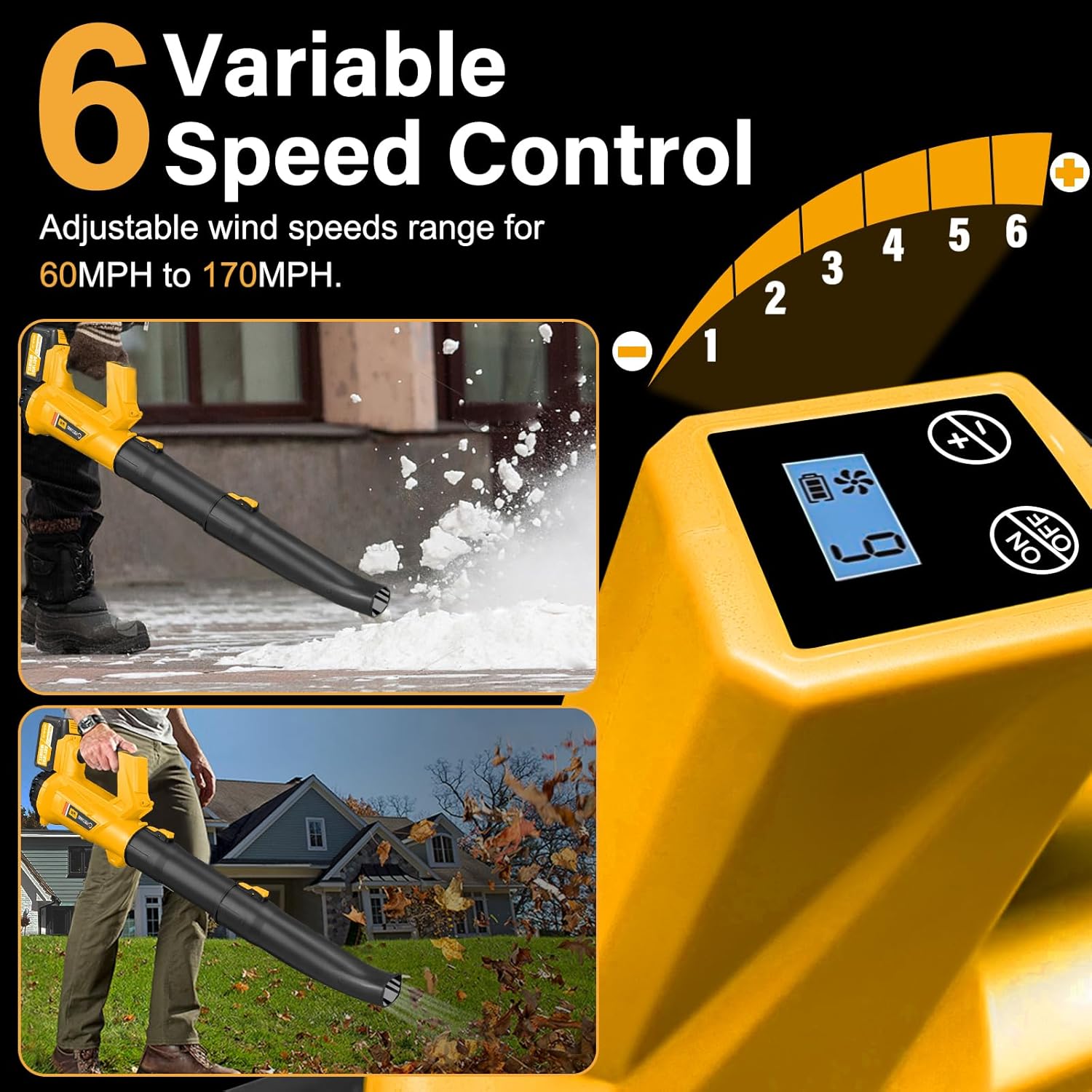 - ăWide ApplicationăLeaf blower cordless with battery and charger can be widely used in various scenes in daily life, leaves in the yard and deck, snow covering the car, dust and garbage in the garage and porch, sawdust in the craftsman's studio can all be blown away by this powerful cordless leaf blower.