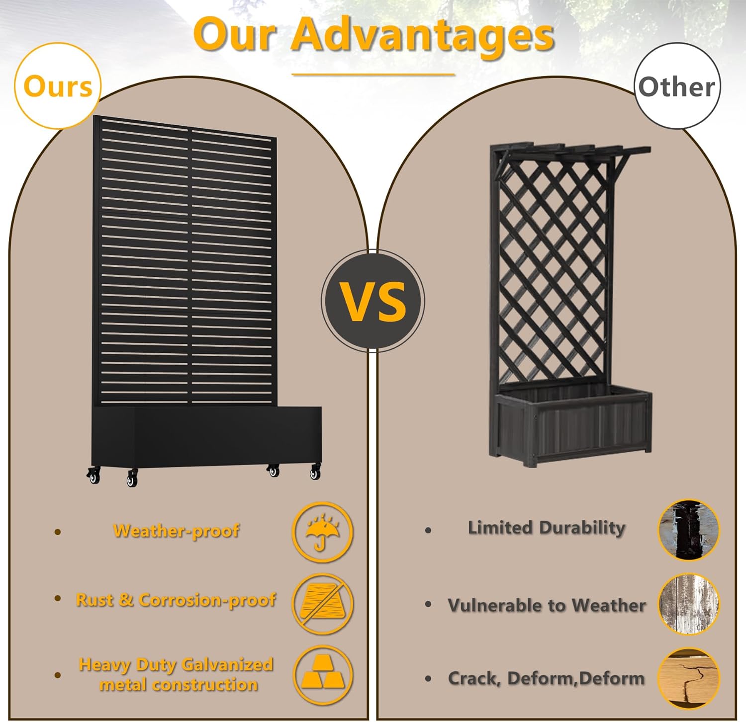 - 【Weather-Resistant Galvanized Steel Structure】Built from premium galvanized metal with multi-layer rustproof coating, this metal planter box with trellis withstands outdoor elements. Its weighted base ensures superior stability and long-lasting durability, making it ideal for year-round outdoor use.
