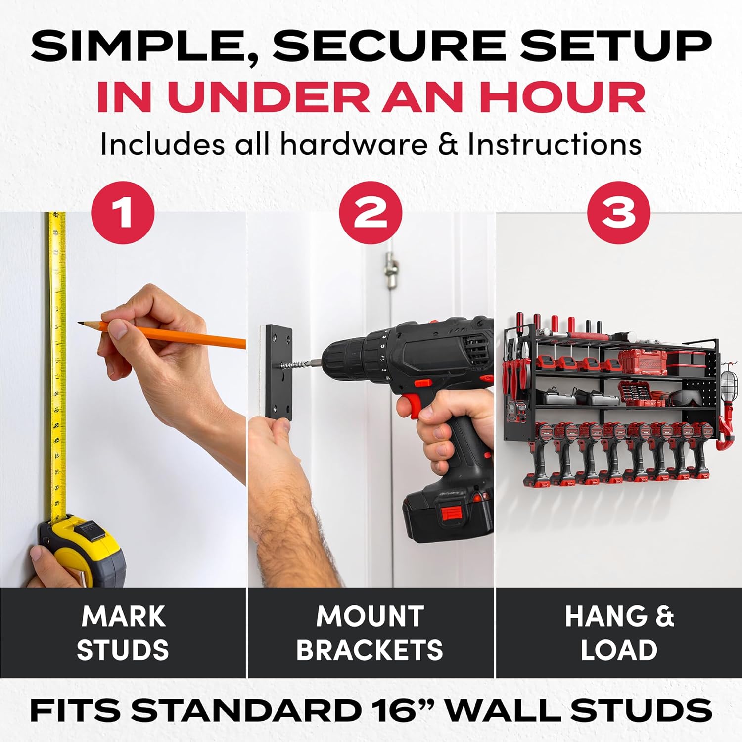 - EASY INSTALL GUIDE: Our drill storage rack mounts securely to walls in garages, basements, or work areas. Follow the instructions and get a cleaner, more productive setup without delays. For a sleek and robust power tool wall mount, click 'ADD TO CART'!