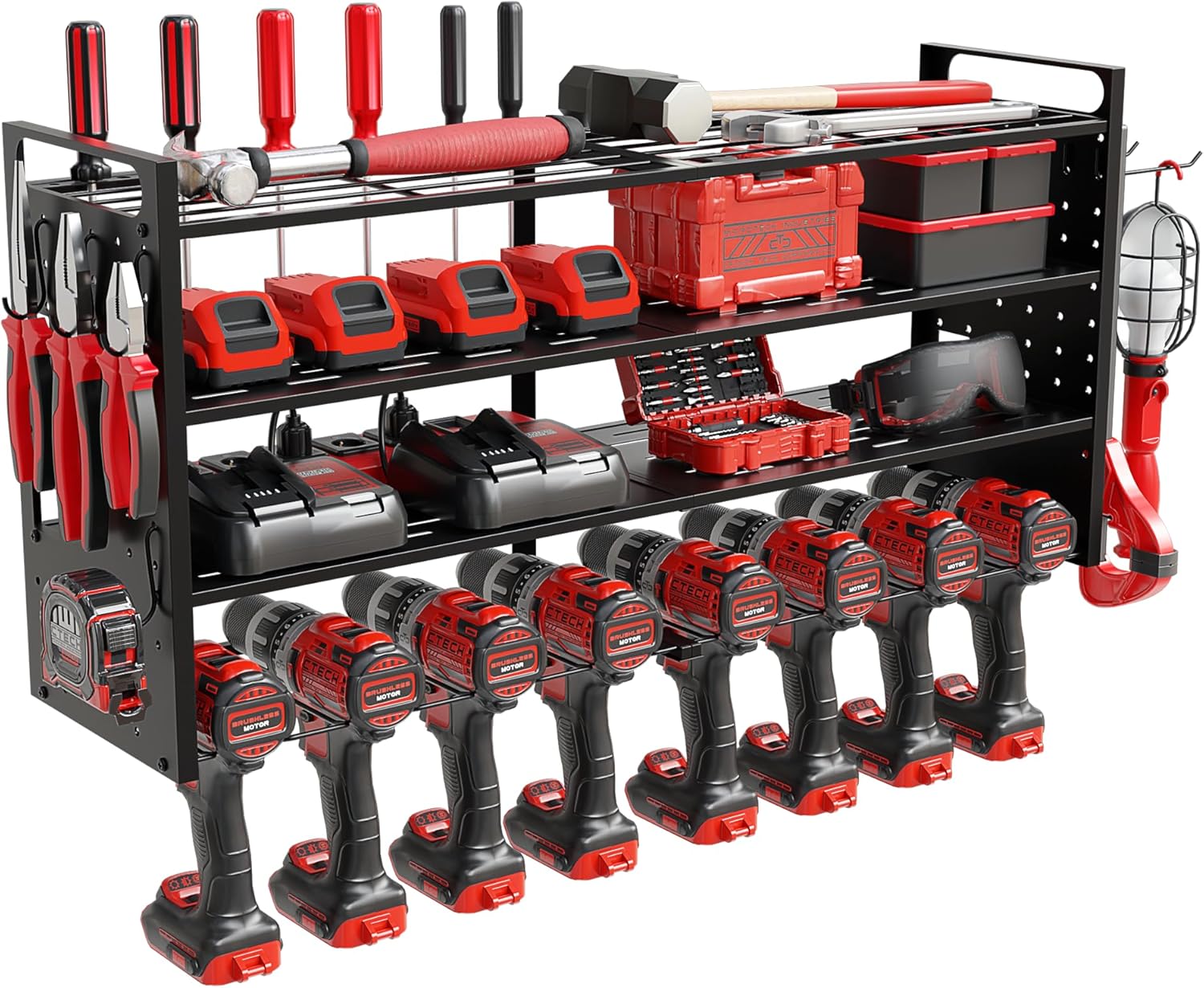 Power Tool Organizer Wall Mount - Power Tool Storage Rack with 3 Shelves, 8 Drill Holders, Bit Holder, Load 300 lbs, Pegboard Sides Storage for Tools- Garage Drill Organizer, Ultimate Workshop Station