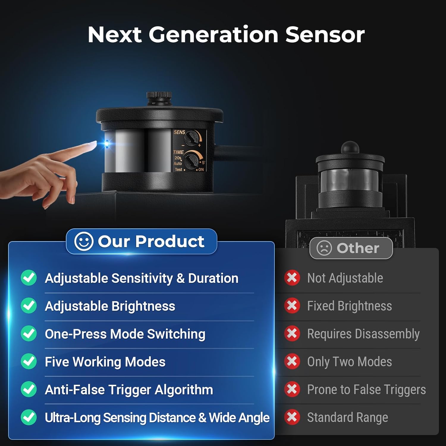 - [One-button Mode Switching & Dual Knob Setting] You can easily switch to ECO or DIM or D2D mode at any time with a touch of the sensing button, and the motion sensors of outdoor lanterns for porch remember your last setting. In addition, you can adjust the porch lights outdoor sensors' detection range or the lighting holding time just by turning a knob. It's easy to enjoy smart, energy-efficient living without having to understand complicated programs.