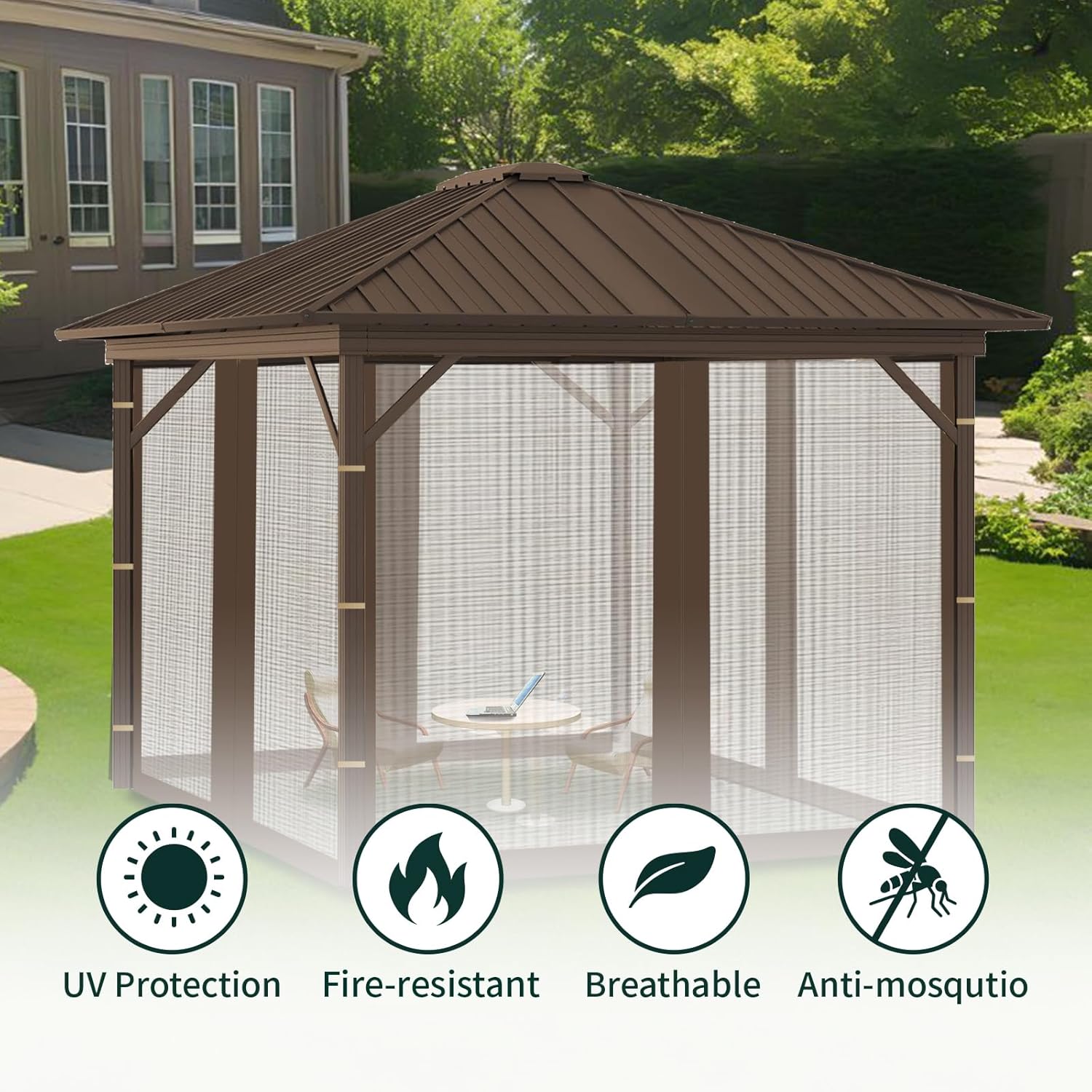 - 【High Quality Material】The gazebo mosquito netting is made of durable polyester fabric. It is UV - resistant ,breathable and NFPA 701 certified for flame retardancy.With 4 - panel mesh screen walls, it creates a cool, clean, mosquito-free outdoor space for hot summer.