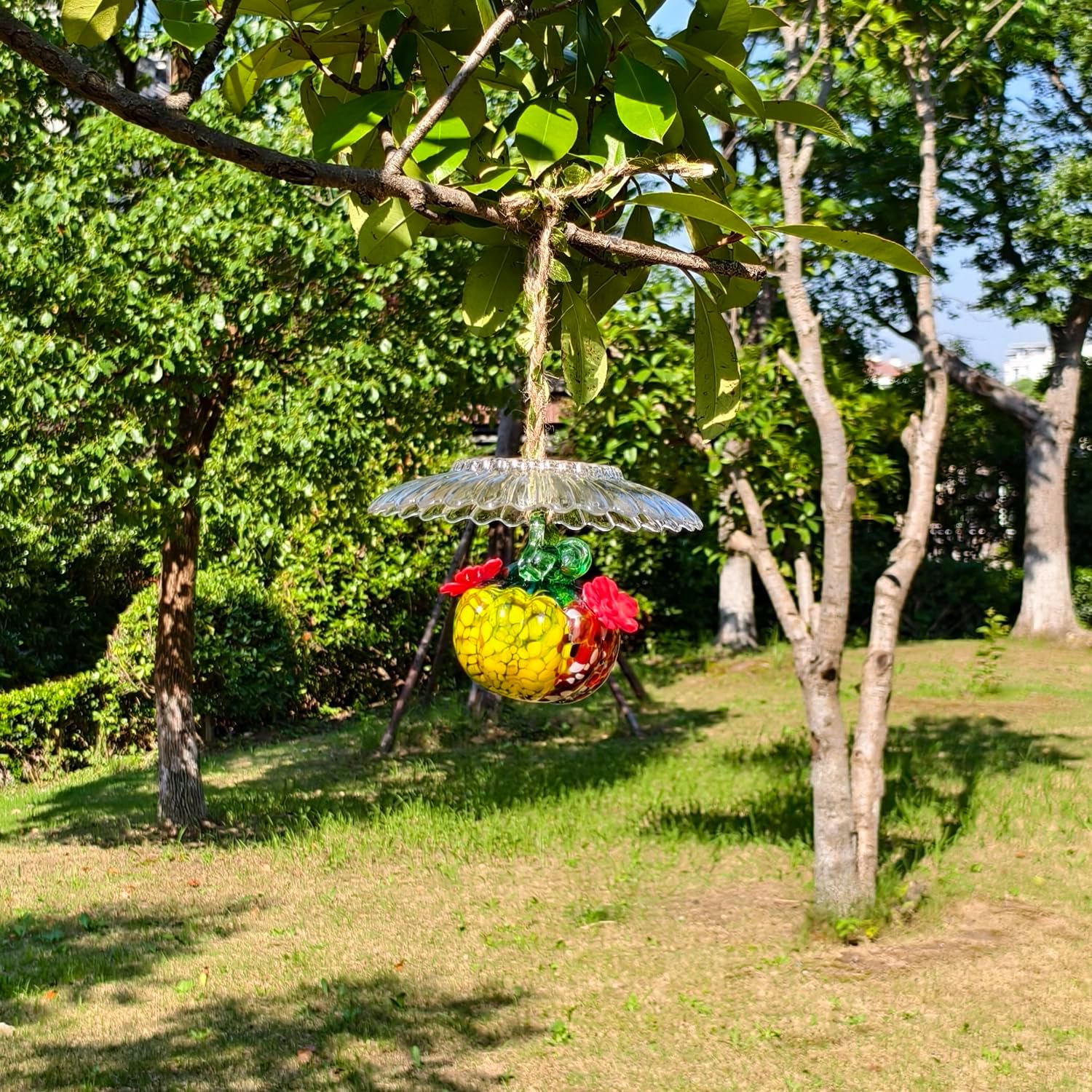Small Glass Hummingbird Feeders for Outdoors Hanging + Rain Cover - Hand Blown Glass Pumpkin Nectar Feeding, 2 Flowers Feeding Ports, Decor for Garden/Backyard Outside, Multi Color