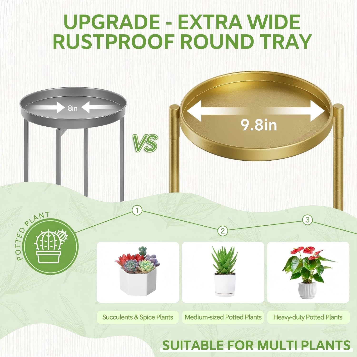 - 9.8 In Extra Wide Round Tray: This corner plant stands for indoor plants has been upgraded with an enlarged 9.8-inch diameter metal round tray with a total weight capacity of 196 lbs for large & heavy duty potted plants. The tiered plant stand is made of sturdy and durable iron with a waterproof and rustproof golden lacquer finish, making it suitable for indoor and outdoor use
