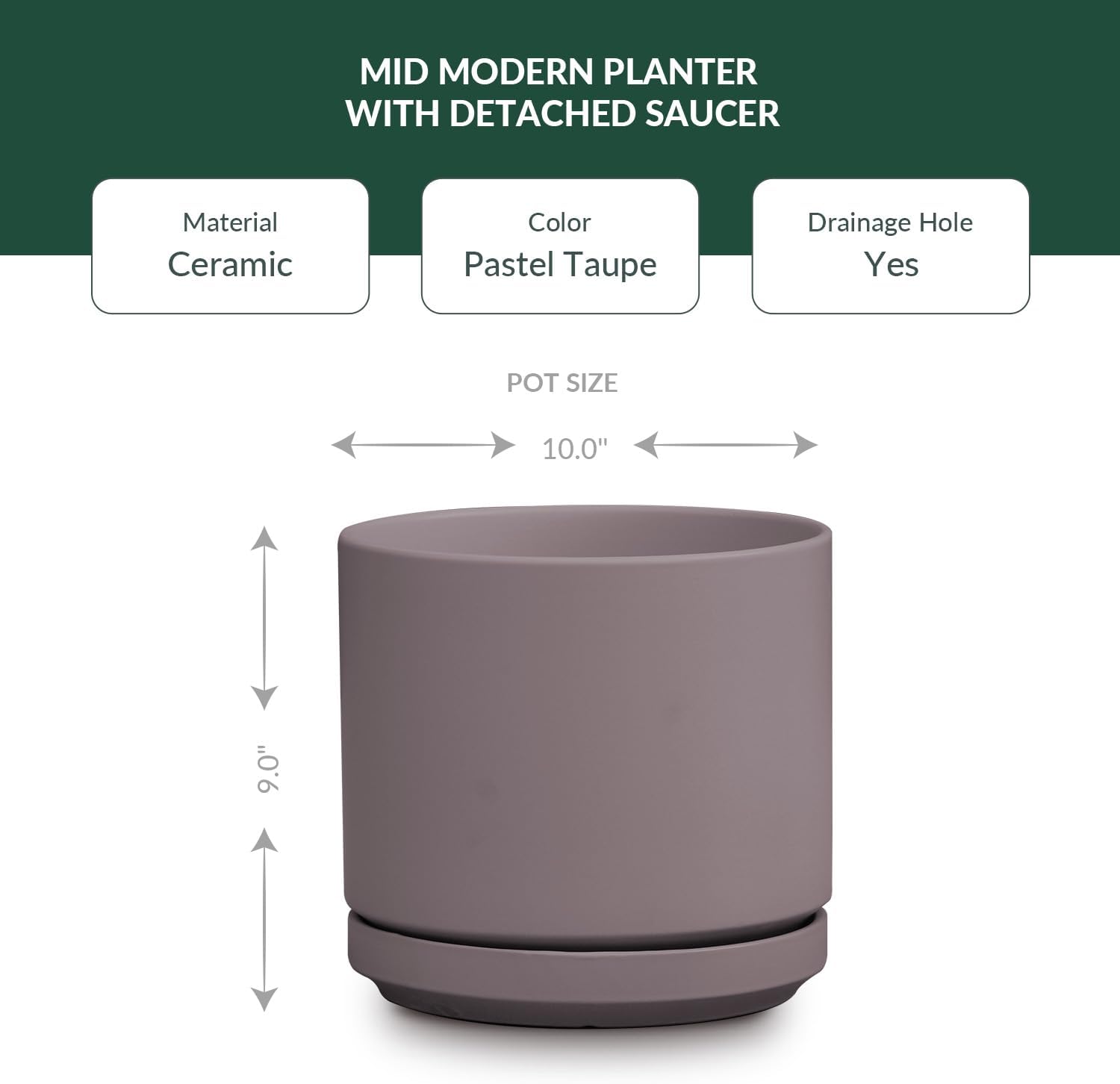 Ceramic Mid Modern Planter Pots with Detached Saucer - Indoor/Outdoor Plant Pots with Drainage Hole