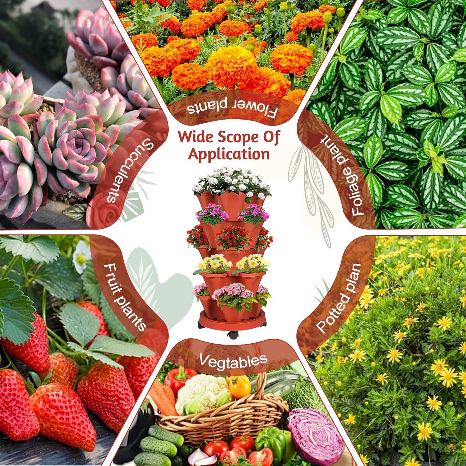 Vertical Strawberry Planter-5 Tier Stackable Herb Tower Planters Stacking Garden Planters Pot Outdoor with Tools Removable Wheels for Growing Flowers, Vegetables and Succulents