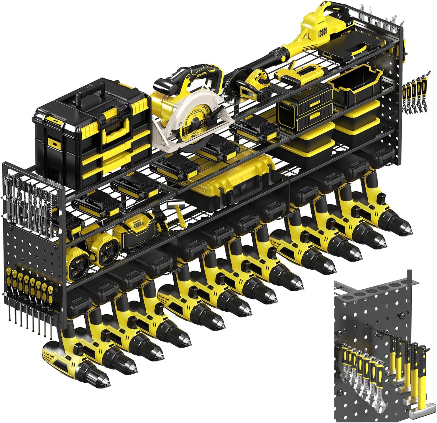 - 💪【52.4" Large 4-Tier Power Tool Organizer with 12 Drills Holder】 This power tool organizer wall mount features a 4-tier structure with a total length of 52.4 inches. Store up to 12 drills on the bottom tier, with spacious compartments above for batteries, toolboxes, hammers, angle grinders, heat guns, and more. Ideal for keeping every tool within reach and your garage clutter-free.