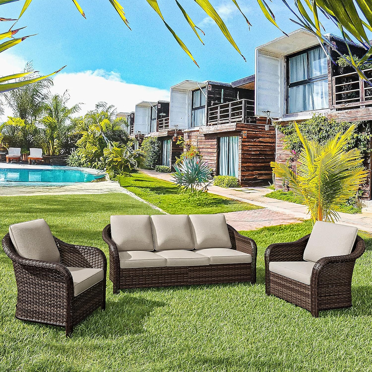 - Packing Included: The 3 pcs set includes 2 x armchairs, 1 x 3-seat sofa. The tools and instructions needed for installation will also be in the box.The 4 pieces patio dining set will come in 2 boxes. They may come in different days