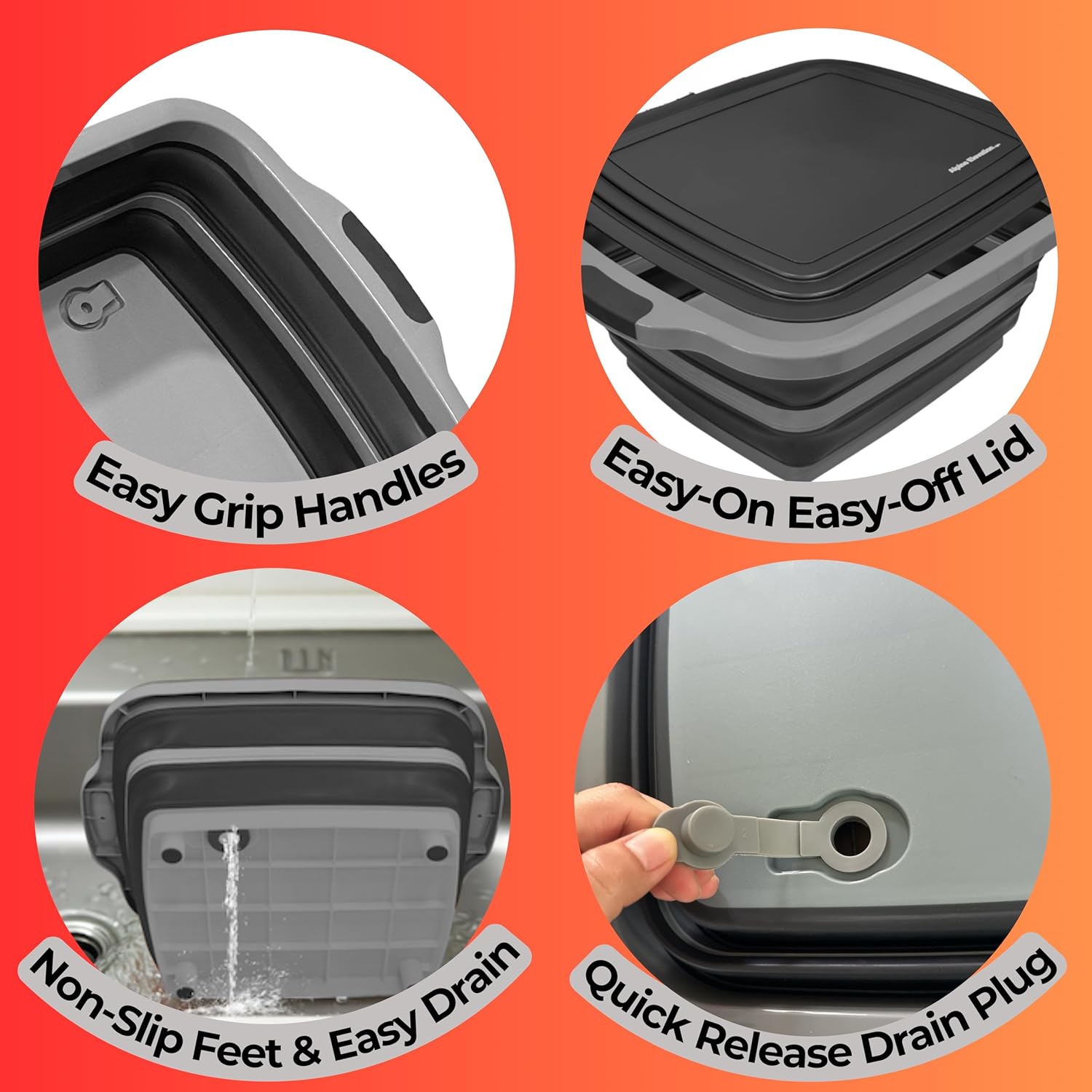 Collapsible X-Large (16L) BBQ Marinating Tub w/Cutting Board | Multipurpose Food-Grade TPE Prep Tub w/Lid | Built-In Colander & Drain Plug - For Camping | Tailgate | Picnic - Slate Black
