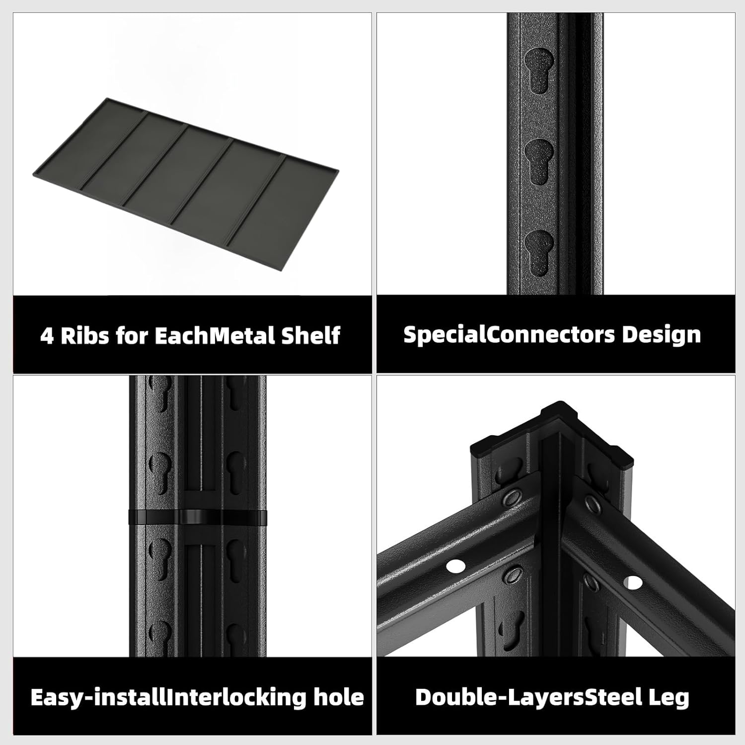 - 5 Tier Metal Shelf Unit: The garage shelves are constructed with reinforced, double-layered uprights that deliver exceptional load-bearing capacity, ensuring long-term use and stability. Each shelf incorporates 3 reinforcing rods , enhancing stability and ensuring even weight distribution for the safe storage of heavy items.