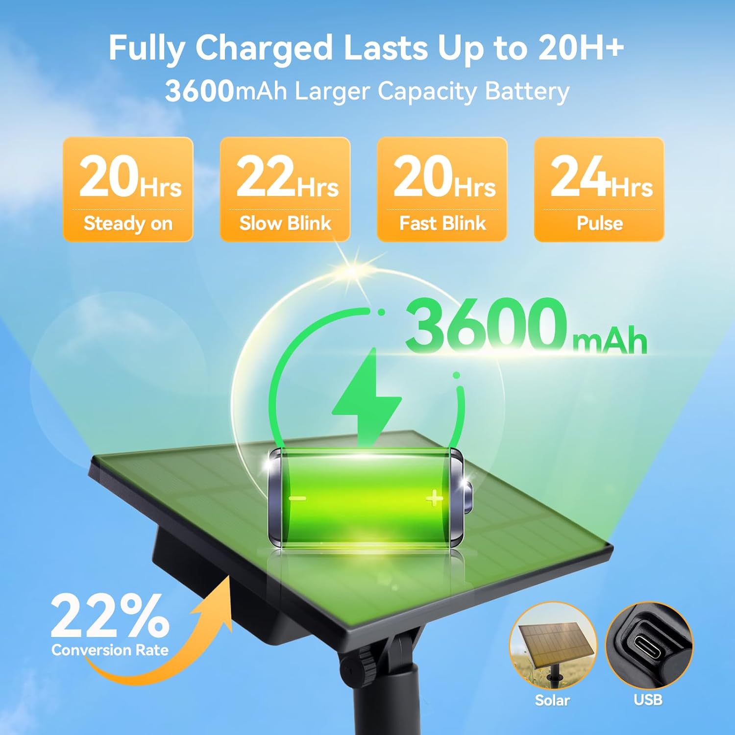 - ăSolar Charging & USB ChargingăThese solar patio lights feature a robust 3600mAh battery, delivering adjustable illumination lasting 10 to 20 hours on a full charge (varies by selected mode). With dual charging flexibility, solar or USB charging, youâll enjoy seamless operation even during extended cloudy days. For optimal performance, charge via sunlight by placing the panel in direct sunlight for 8 hours, or fast-track charging with the USB port to reach full power in just 4 hours. Effortlessly sustain all-night ambiance, rain or shine.