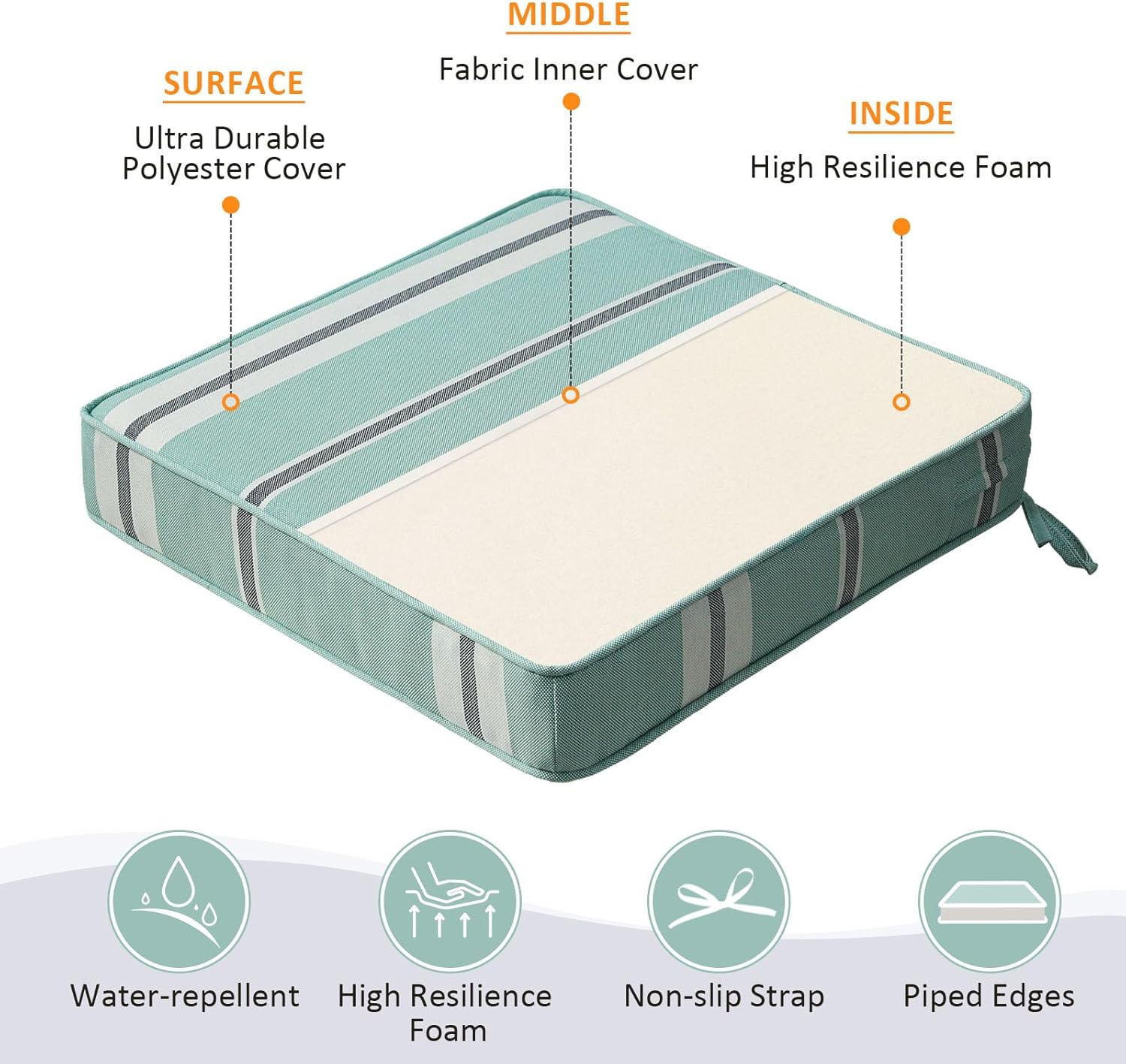 - 【Non-slip Ties and Piped Edge】 The two non-slip ties can be fastened to your furniture to keep the outdoor cushion in place. Some seams are finished with piping, which reinforces the edges and makes the outdoor furniture cushion more stylish.