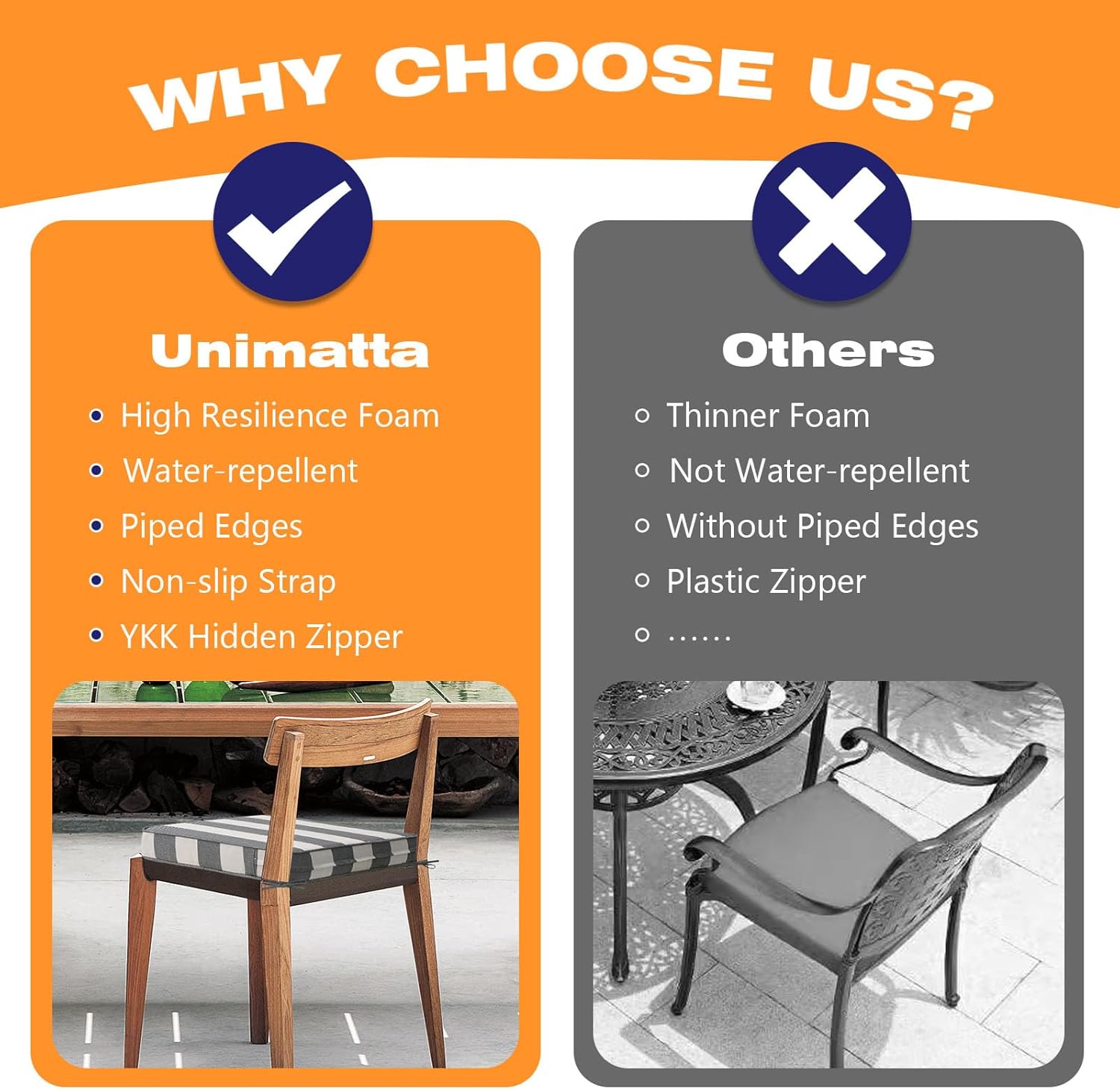 - 【High Resilience Foam】 The Unimatta chair cushions are filled with high-quality 100% foam, high-density sponge offers excellent support and long-lasing comfort. Whether you're enjoying a sunny afternoon or a cool evening, this cushion will keep you cozy.