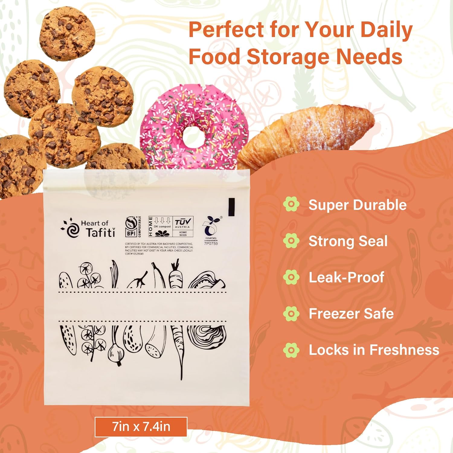 - Certified Compostable in U.S. & Europe: Heart of Tafiti resealable food storage bags are certified compostable, meeting the highest-rated standards, including ASTM D6400, European EN 13432, and BPI certification, ensuring they decompose in industrial composting facilities.