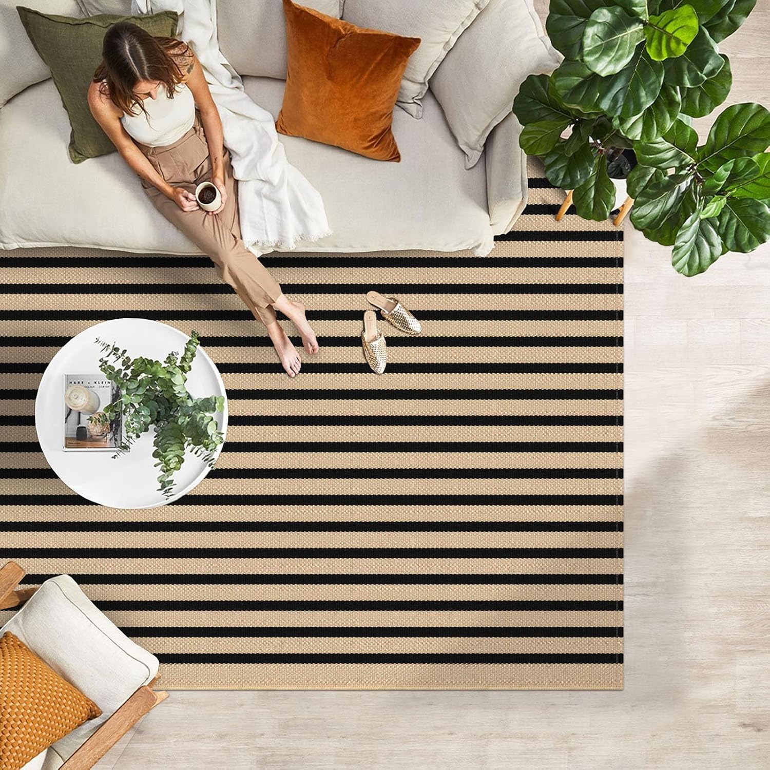 - Easy to Clean: This tan and black striped rug is simple to maintain with machine wash or vacuuming to remove dirt. The rug is sturdy and can be tumble dried on low. Keep your door rug fresh and clean with minimal effort. NOTE: Cotton rugs normally shrink slightly after washing