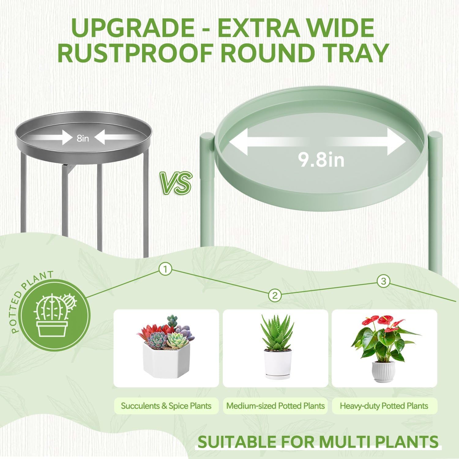 - 9.8 In Extra Wide Round Tray: This corner plant stands for indoor plants has been upgraded with an enlarged 9.8-inch diameter metal round tray with a total weight capacity of 138 lbs for large & heavy duty potted plants. The tiered plant stand is made of sturdy and durable iron with a waterproof and rustproof golden lacquer finish, making it suitable for indoor and outdoor use