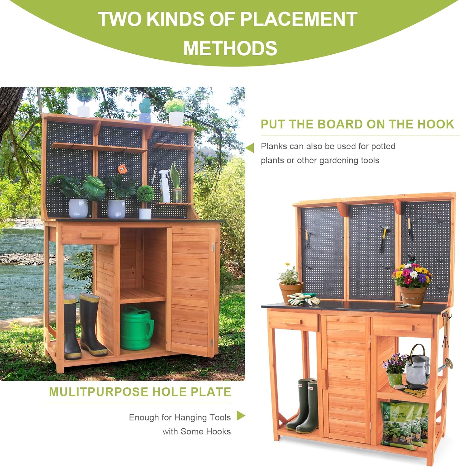 - 【Premium Natural Fir Wood】:Potting bench for outside is specially designed for your garden,The main body is 100% fir wood and configure a holey metal plate,complimentary 18 hooks used for metal hole board.Configured with 5 pieces of laminate used for slatted shelf ,Feel free to mix and match the way you want to use it