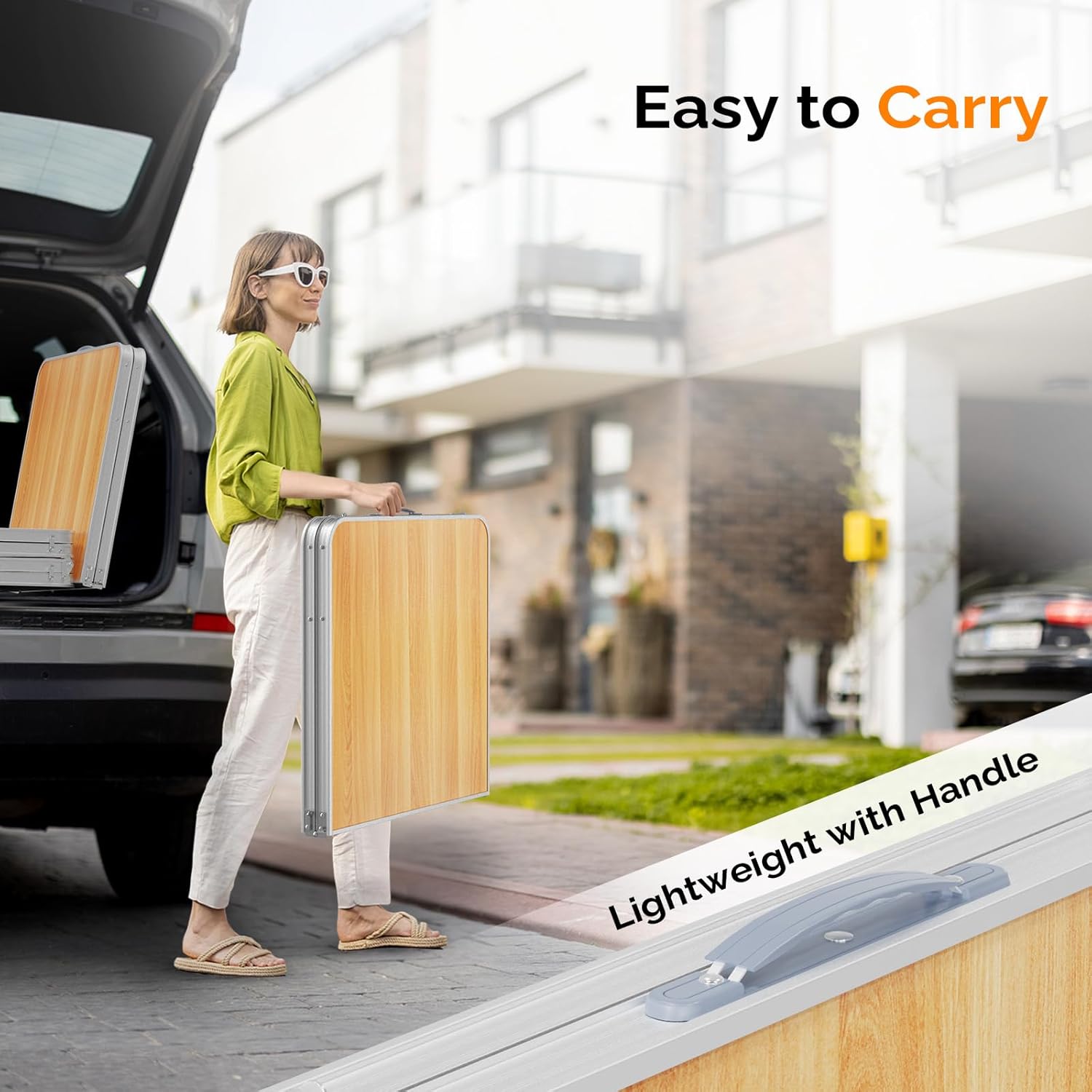 - LIGHTWEIGHT&FOLDABLE: MDF tabletop and aluminum feet make its weight just 9.9 lbs. The feet could be set off and tabletop could fold in half, foldable like suitcase(23.8"*23.8"). It is convenient to carry it to anywhere with its soft carry handle.