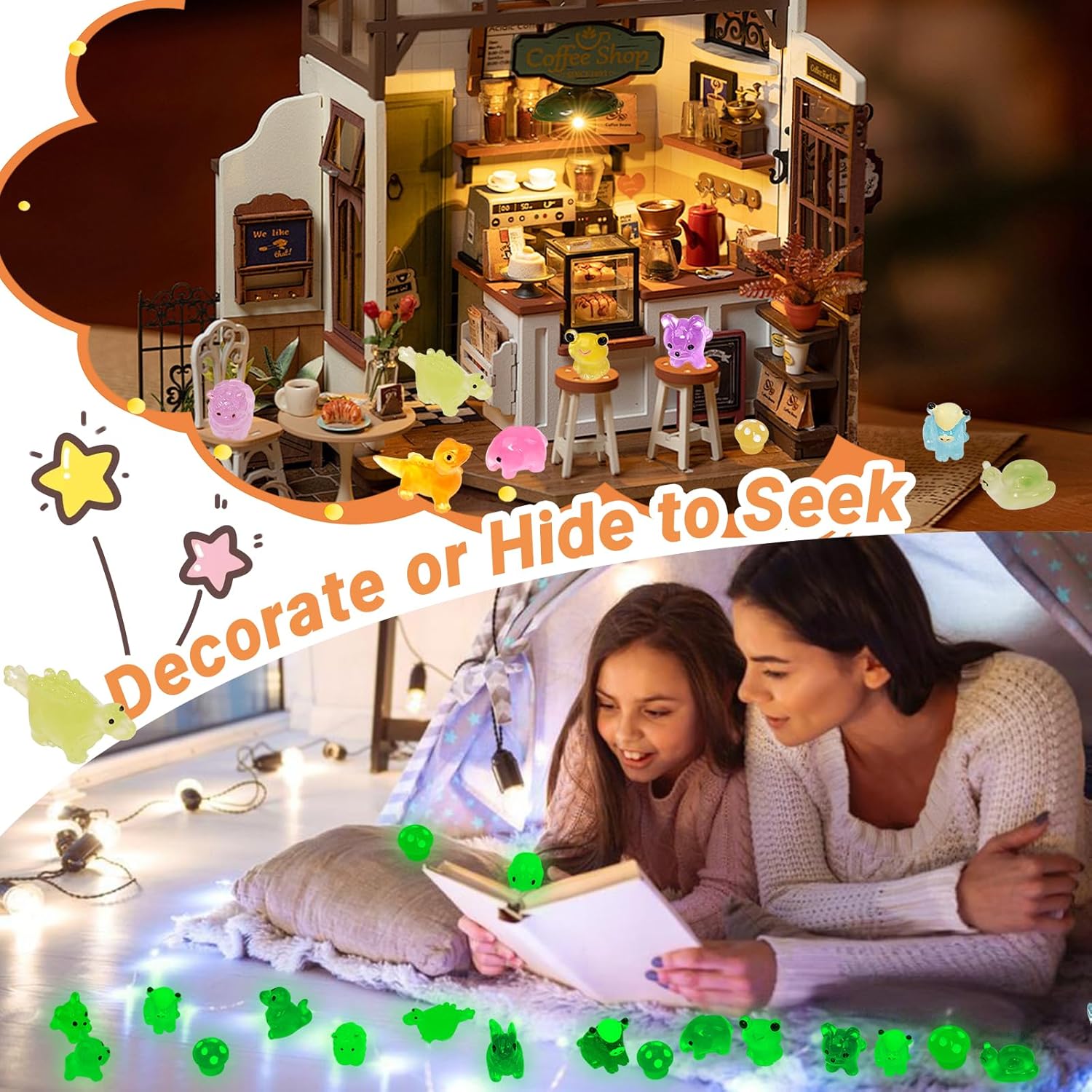 Mini Resin Animals Figures to Hide, 72 PCS Tiny Animal Figurines Small Plastic Animals Variety Pack Luminous Glow in The Dark, Little Ducks Miniature Dinosaurs for Fairy Garden Aquarium Decor