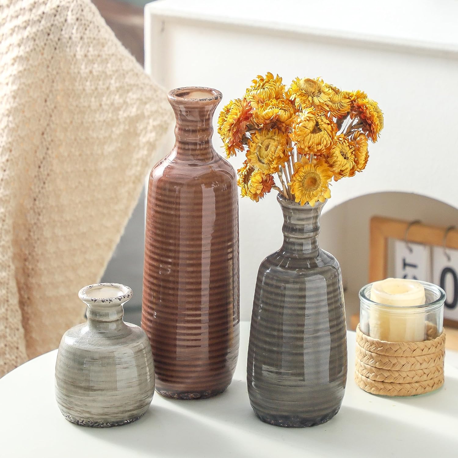 - 【For Multiple Home Décor Styles】Designed in a variety of shapes and sizes, this rustic vases set is a perfect home décor even without flowers. Whether your style is bohemian, modern farmhouse, rustic, or homey, they all fit in perfectly show off your lifestyle and decorative sense of style. (Length X Diameter=10.43x2.95", 7.87x2.95",4.33x2.95").