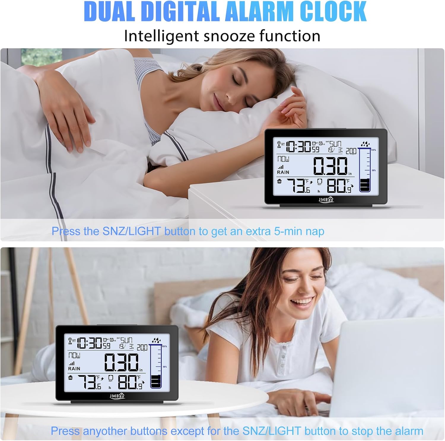 - Multi Function Rain Gauge Weather Station --- In addition to rainfall monitoring, this digital rain gauge can also provide real-time indoor and outdoor temperatures, WWVB Radio control time function. Whatโs more, dual alarm clock with snooze function and calendar is practical in your usual life. Functional and stylish, JMBay rain gauge weather station is the perfect decoration for your living room, bedroom, office, greenhouse, tent, and more.